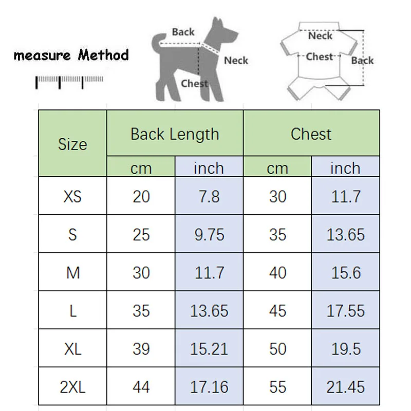 Espesar, el tamaño de la ropa es más grande de 3 a 4 cm de lo que mide el tamaño del perro. Si está entre 2 tamaños, elija el tamaño grande.