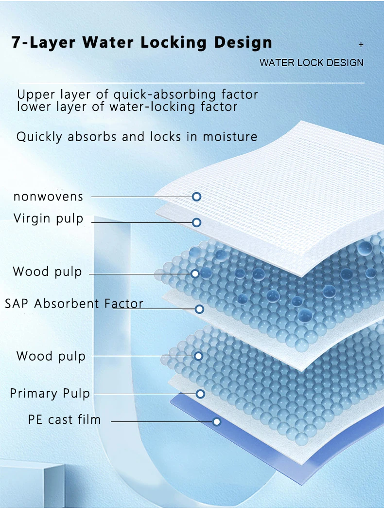 Absorbente RÁPIDO Y A PRUEBA DE FUGAS: Con un núcleo súper absorbente que puede retener la humedad absorbiendo y convirtiendo instantáneamente el líquido en gel.Este producto también cuenta con respaldo y borde de plástico para evitar fugas.