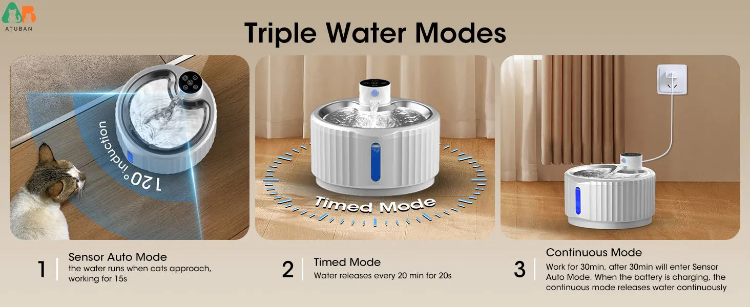 【3 modos de agua】- Agua potable feliz, la fuente inalámbrica para gatos ofrece un flujo de grifo simulado, más opciones para satisfacer las necesidades de su mascota.1 Modo de detección: activa el flujo de agua durante 15 segundos cuando una mascota está dentro de 5 pies/1,5 m y 120 grados de ángulo.2 Modo de sincronización: fluye agua durante 20 segundos cada 20 minutos.3 2 Modo continuo: Hidratación de mascotas 24 horas al día, 7 días a la semana (alimentación enchufable).Cambia automáticamente al modo inductivo después de 30 minutos con batería