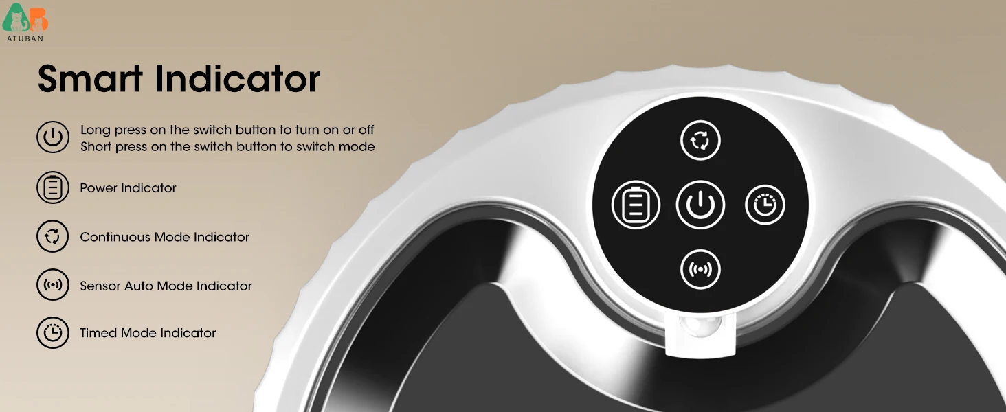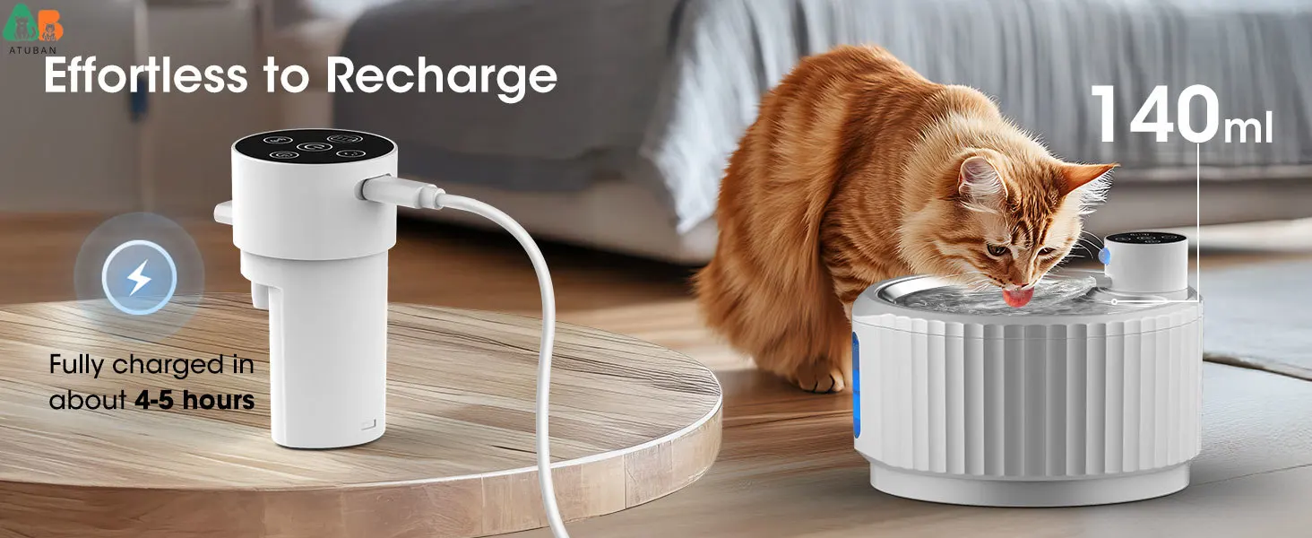 Fuente de agua inalámbrica para gatos ATUBAN: el diseño inalámbrico permite que las mascotas beban agua dulce más libremente.Puede colocar el dispensador de agua para mascotas en su dormitorio, sala de estar, balcón, cocina, en el piso, mesa o incluso alféizar de la ventana.Nunca tendrá que preocuparse de que las mascotas roben los cables, aproveche la libertad inalámbrica y reduzca significativamente los riesgos de seguridad.