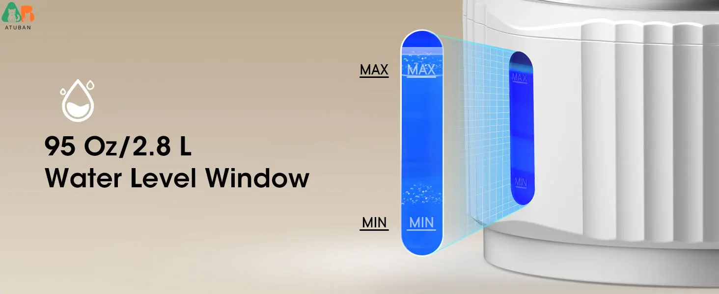 【Gran capacidad de 95 oz/2,8 L】- La fuente de agua inteligente para mascotas tiene una gran capacidad de 95 oz/2,8 L, esta fuente de agua automática para gatos proporciona suficiente agua para varios gatos, con una ventana de nivel de agua para monitorear fácilmente el agua.La función de almacenamiento de agua de la bandeja anterior garantiza que su mascota pueda beber agua normalmente en caso de un corte de energía.Perfecto para todas las razas de gatos y perros pequeños y medianos.