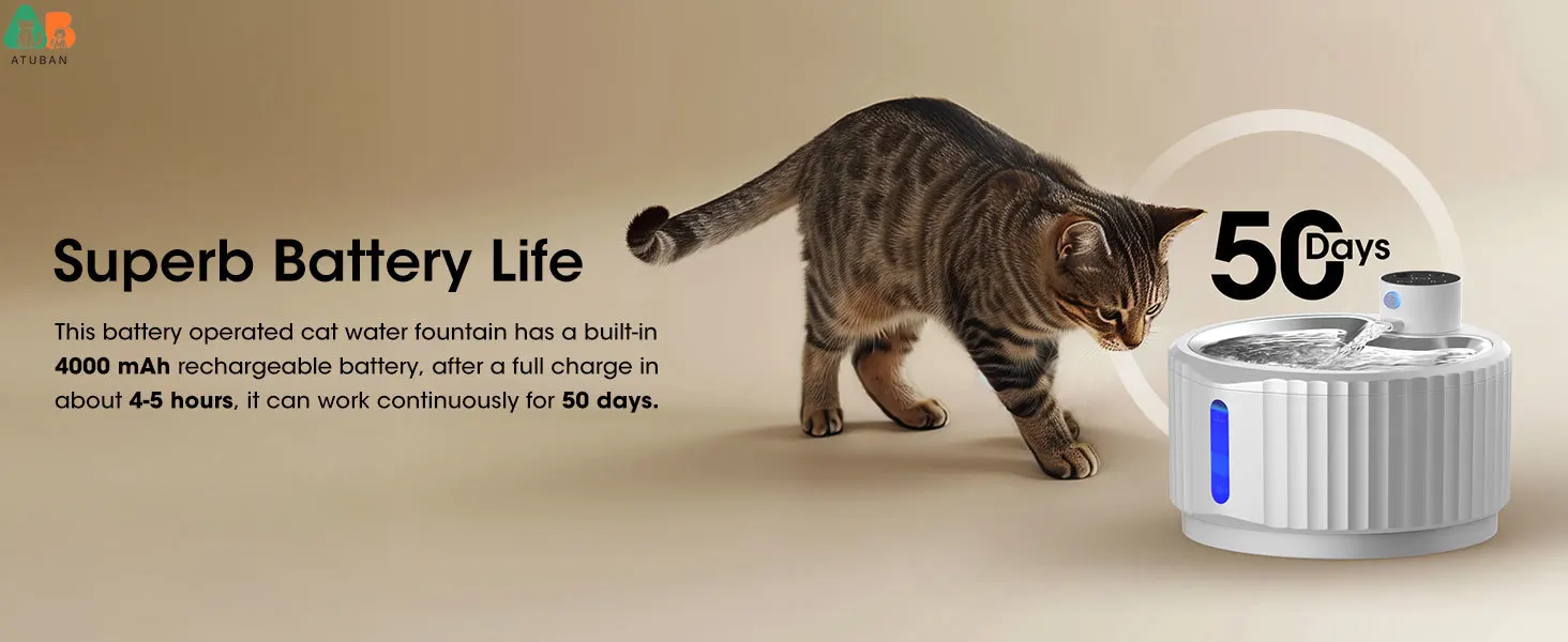 Excelente duración de la batería: con una batería recargable incorporada de 4000 mAh, la fuente inalámbrica para gatos ATUBAN proporciona hasta 35-45 días de agua fresca y limpia a sus mascotas.Tenga la seguridad incluso durante cortes de energía o viajes cortos.Incluso si sales a trabajar, haces un viaje corto o vuelves a casa tarde, tu mascota no tendrá sed