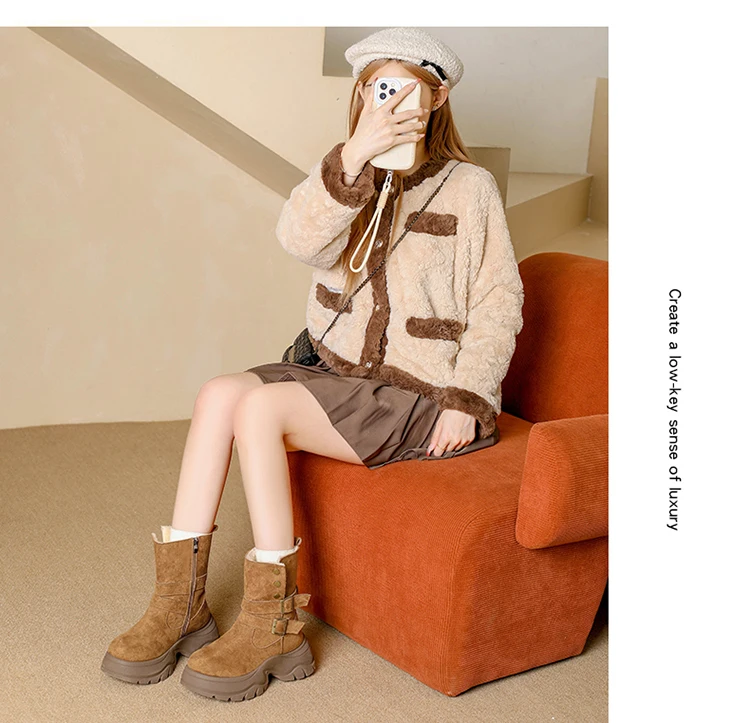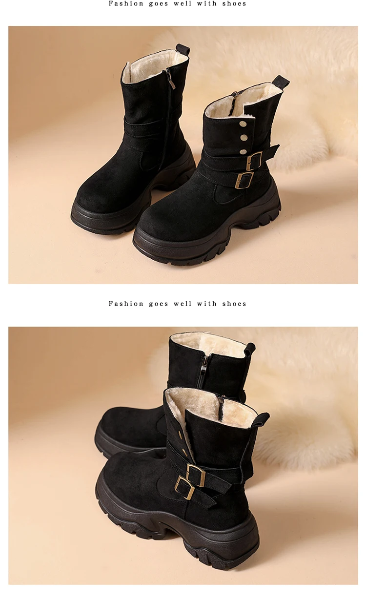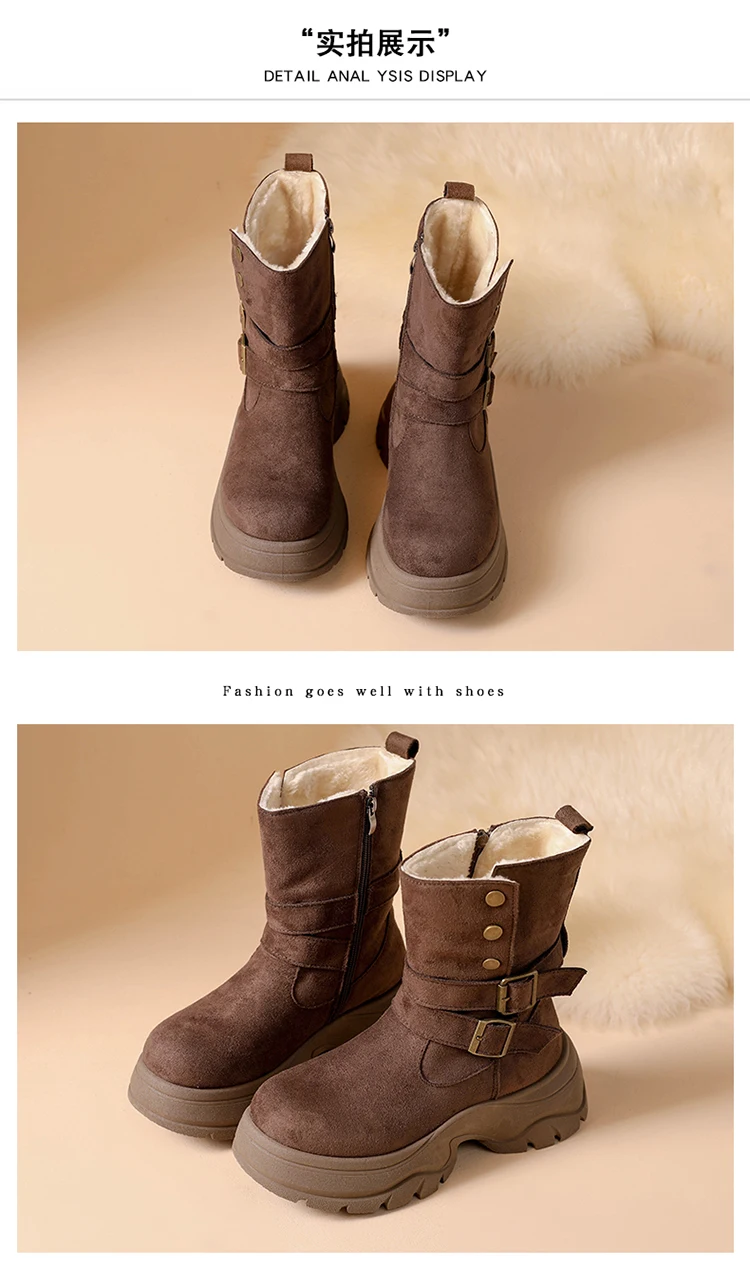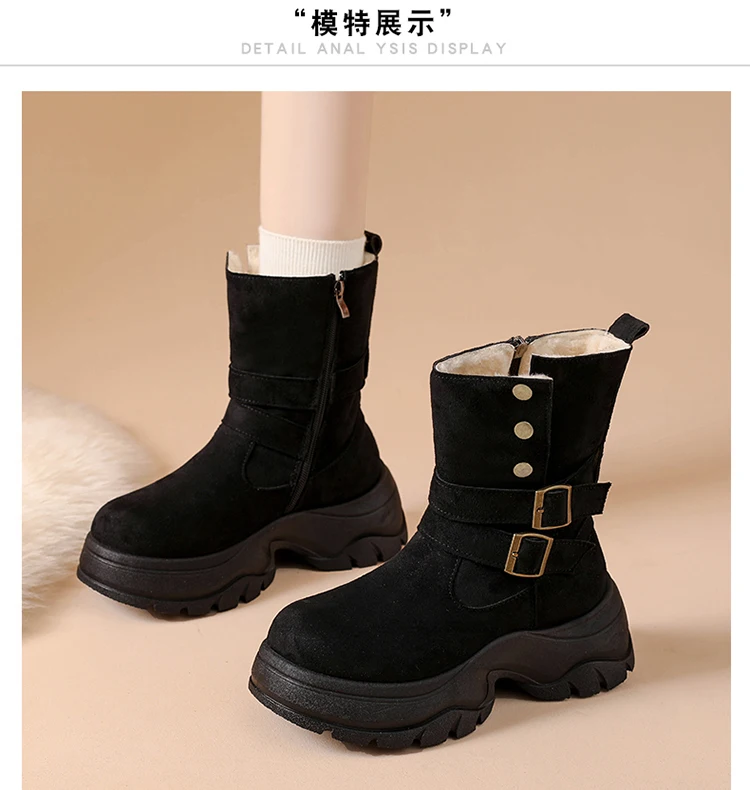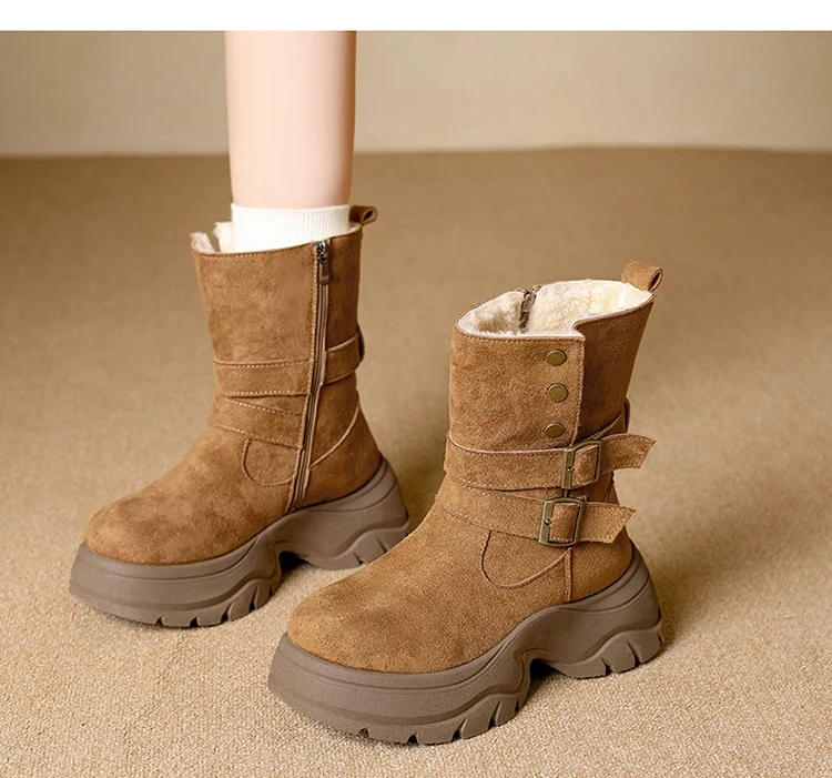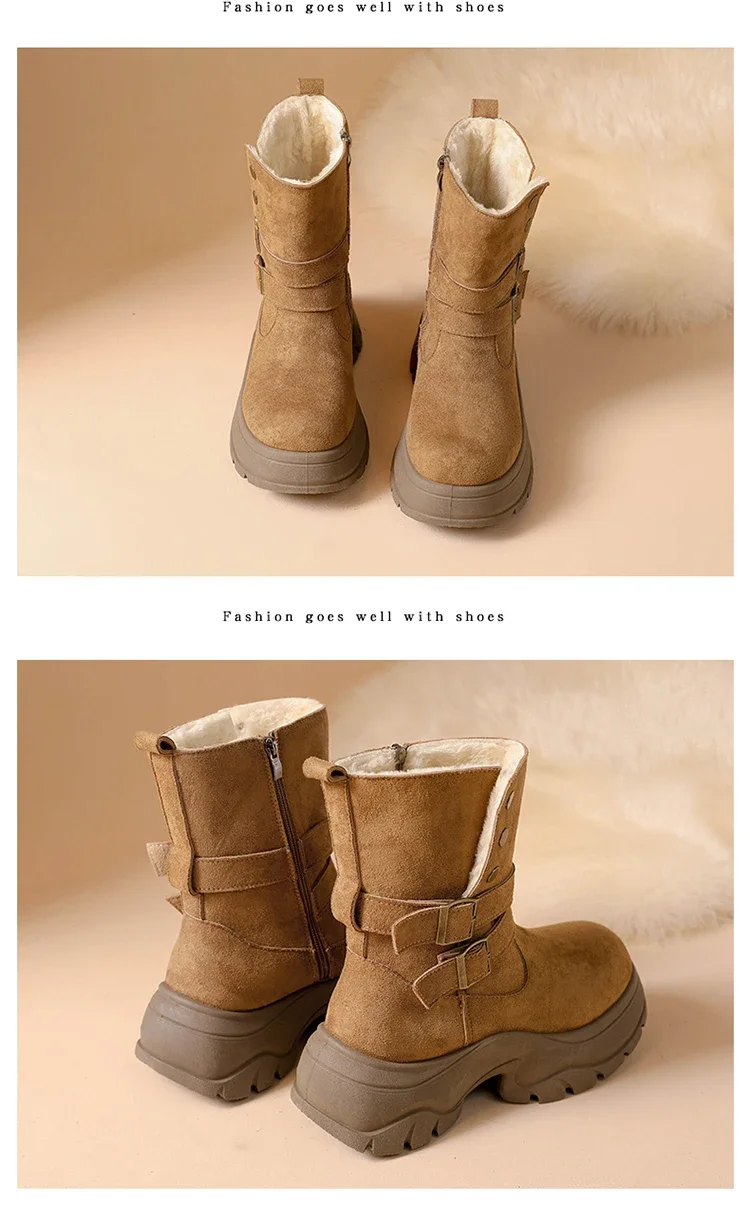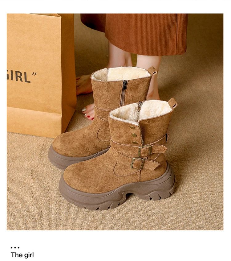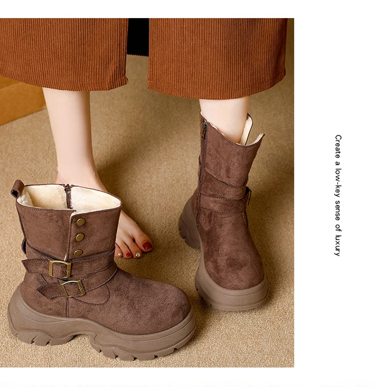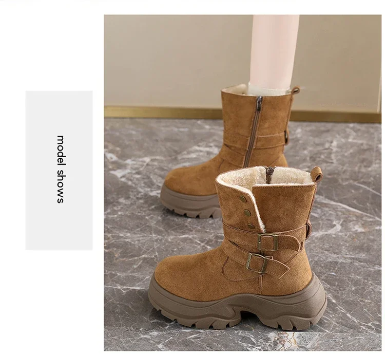 Botas de nieve con hebilla para mujer, botines de invierno con forro de piel cálida a media pantorrilla, botines con suela de orejeta, zapatos para caminar al aire libre de gamuza con plataforma