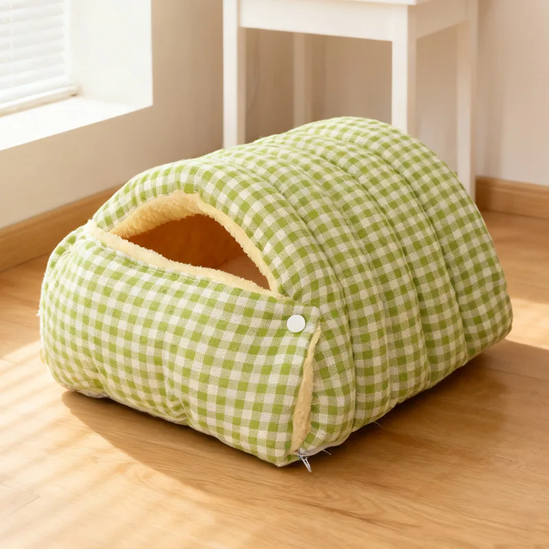 Presentamos nuestra adorable cama para gatos con forma de pantuflas, un refugio acogedor perfecto para tu amigo felino.Disponible en encantadores patrones de giganos verdes y azules, este gato (cama) presenta un diseño único que imita una zapatilla de felpa, ofreciendo a su gato una sensación de seguridad y comodidad.