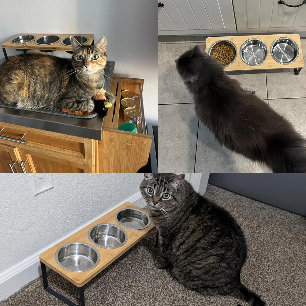 Nuestros tazones de comida para gatos están inclinados en un ángulo de 15° evita el desbordamiento del lavabo de agua. El diseño inclinado también promueve una mejor digestión y absorción de nutrientes y 3 tazones para gatos les brindan una opción de alimento adicional.