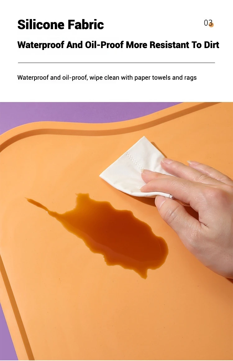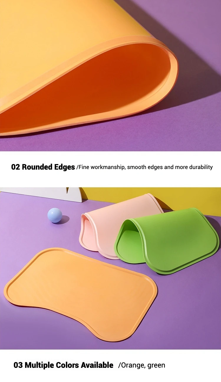 🌟 2. yoDiseño ngenioso de borde enrollable:El borde enrollable inteligente de nuestra alfombra contiene eficazmente derrames y salpicaduras, evitando que los alimentos y el agua escapen sobre el piso, manteniendo su hogar más limpio e higiénico.