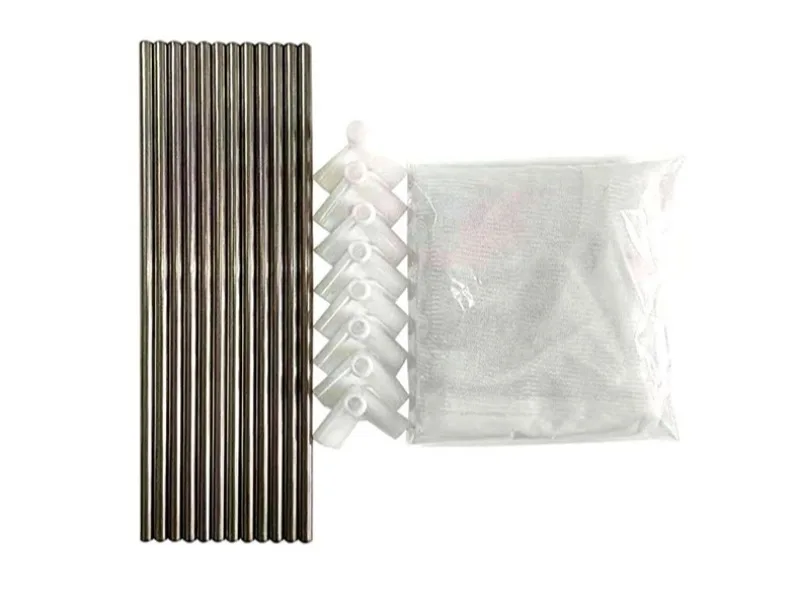 Configuración del producto: bolsa de malla + 12 varillas de acero inoxidable + 8 tee en ángulo recto