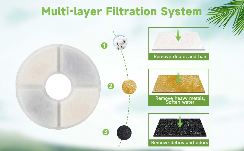 【Todo para la salud de tu mascota】 Los filtros de fuente para mascotas están compuestos de capas de algodón, carbón activado de cáscara de coco y resina de intercambio iónico.Cada gota de agua se filtra mediante filtración de tres capas para eliminar las impurezas y proporcionar agua enriquecida con oxígeno y con mejor sabor.Deje que sus adorables mascotas puedan beber agua limpia y fresca durante todo el día, lo que ayuda a aumentar el consumo de agua.