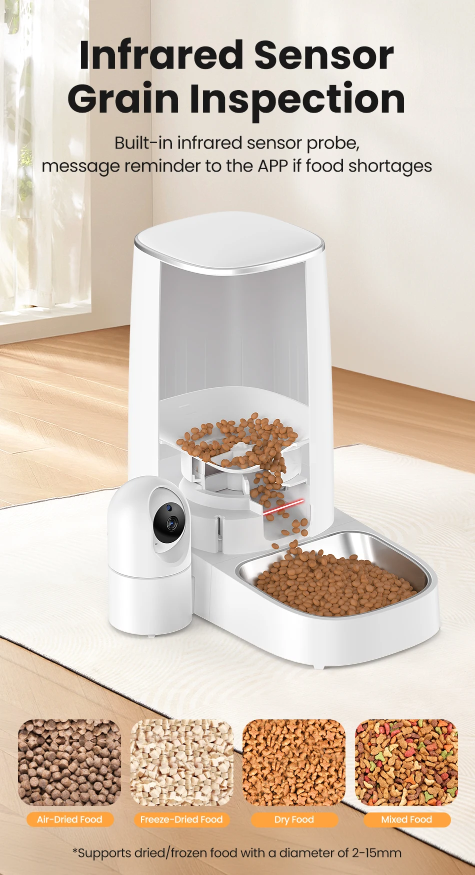 Producto muy fácil de usar, mi gato se acostumbra el primer día. Es fácil cambiar el horario, también puedes agregar una porción adicional que no estuviera programada antes si es necesario. La cámara funciona bien y cambia automáticamente de modo de día a noche, ambos modos funcionan como debería. Los granos no se atascan en el comedero, el recipiente es fácil de limpiar. Recomiendo este producto.