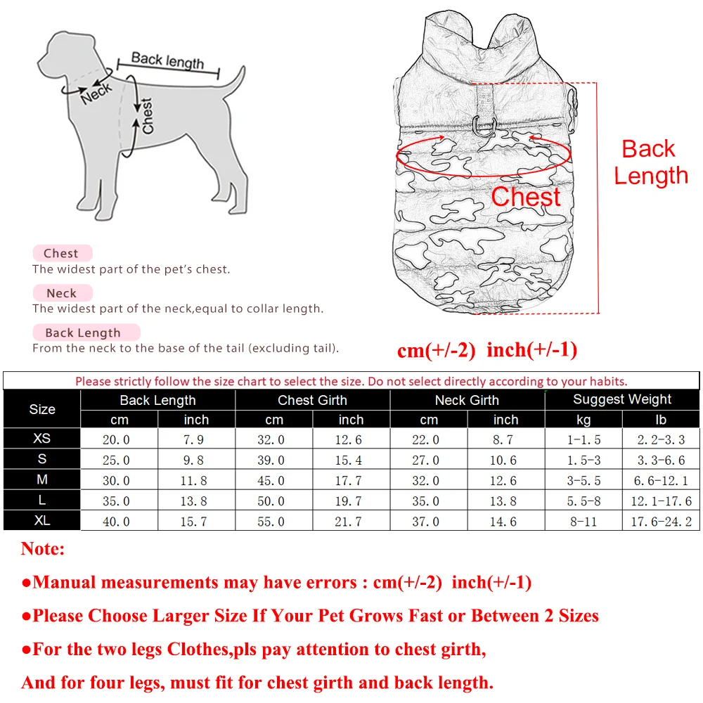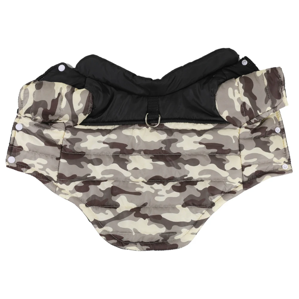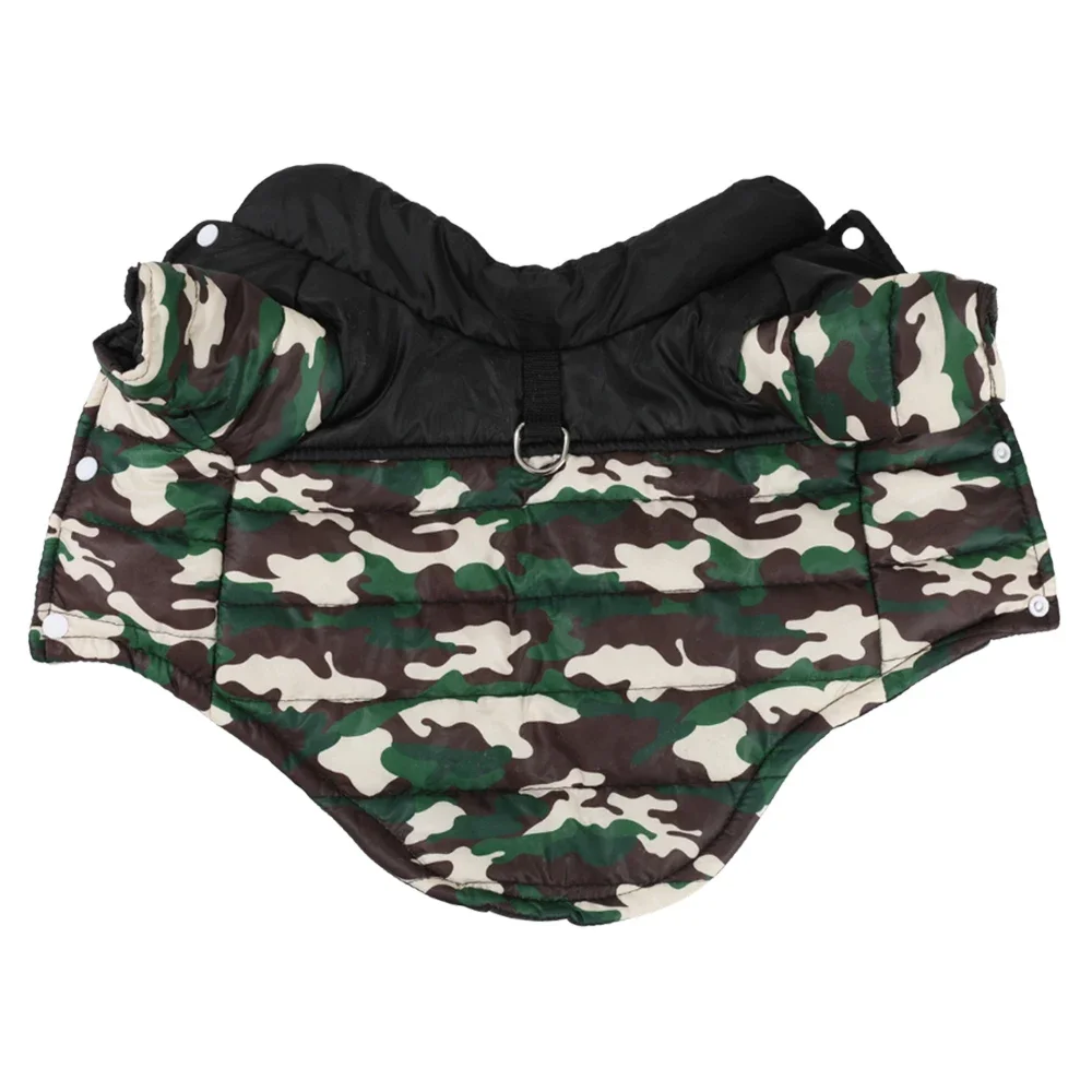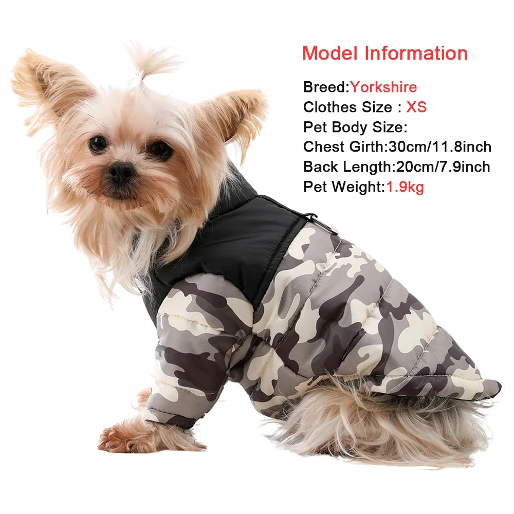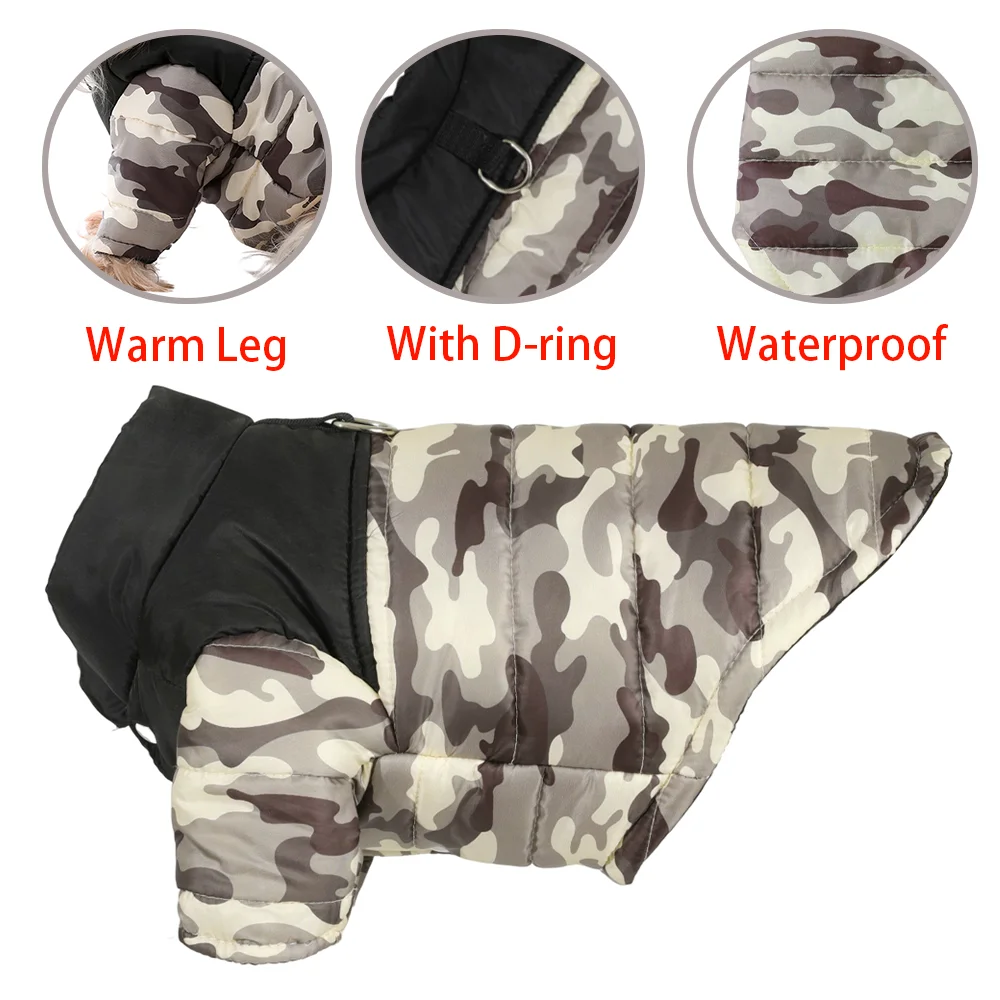 Ropa impermeable para perros para invierno, chaqueta cálida a prueba de viento para mascotas con anillo en D, trajes para mascotas con estampado de camuflaje para perros pequeños y medianos Pug