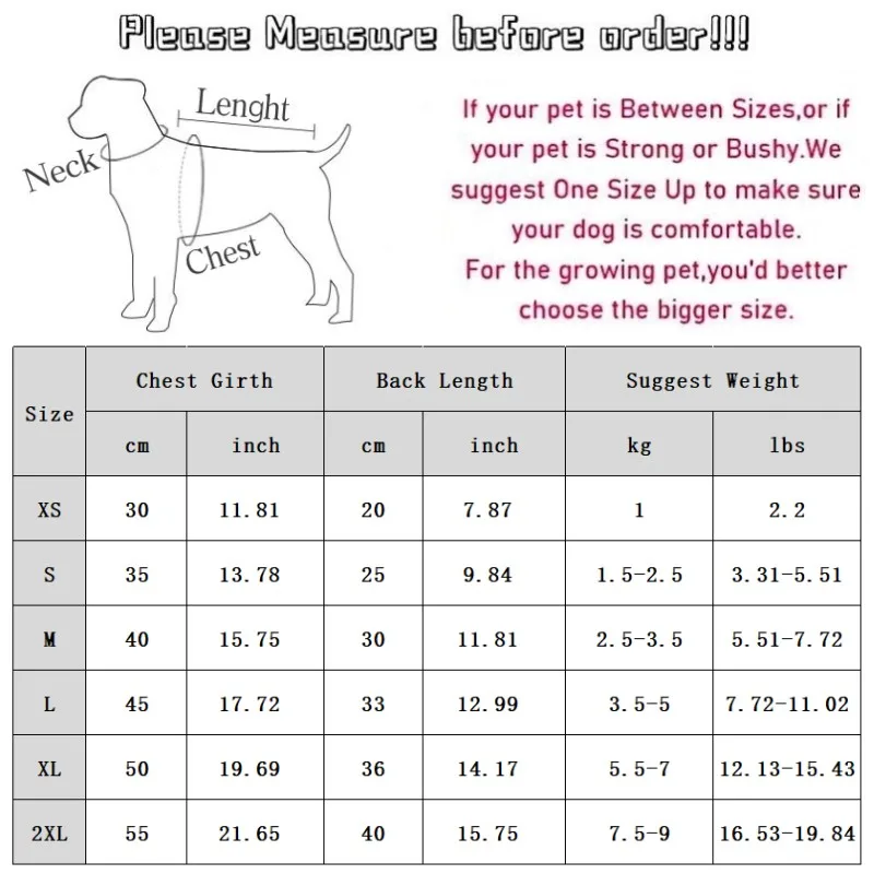 2XL: Pecho 55 cm/21,65''; Longitud 40 cm/15,75 pulgadas; Peso sugerido 7,5-9 kg/16,5-19,84 lbs.