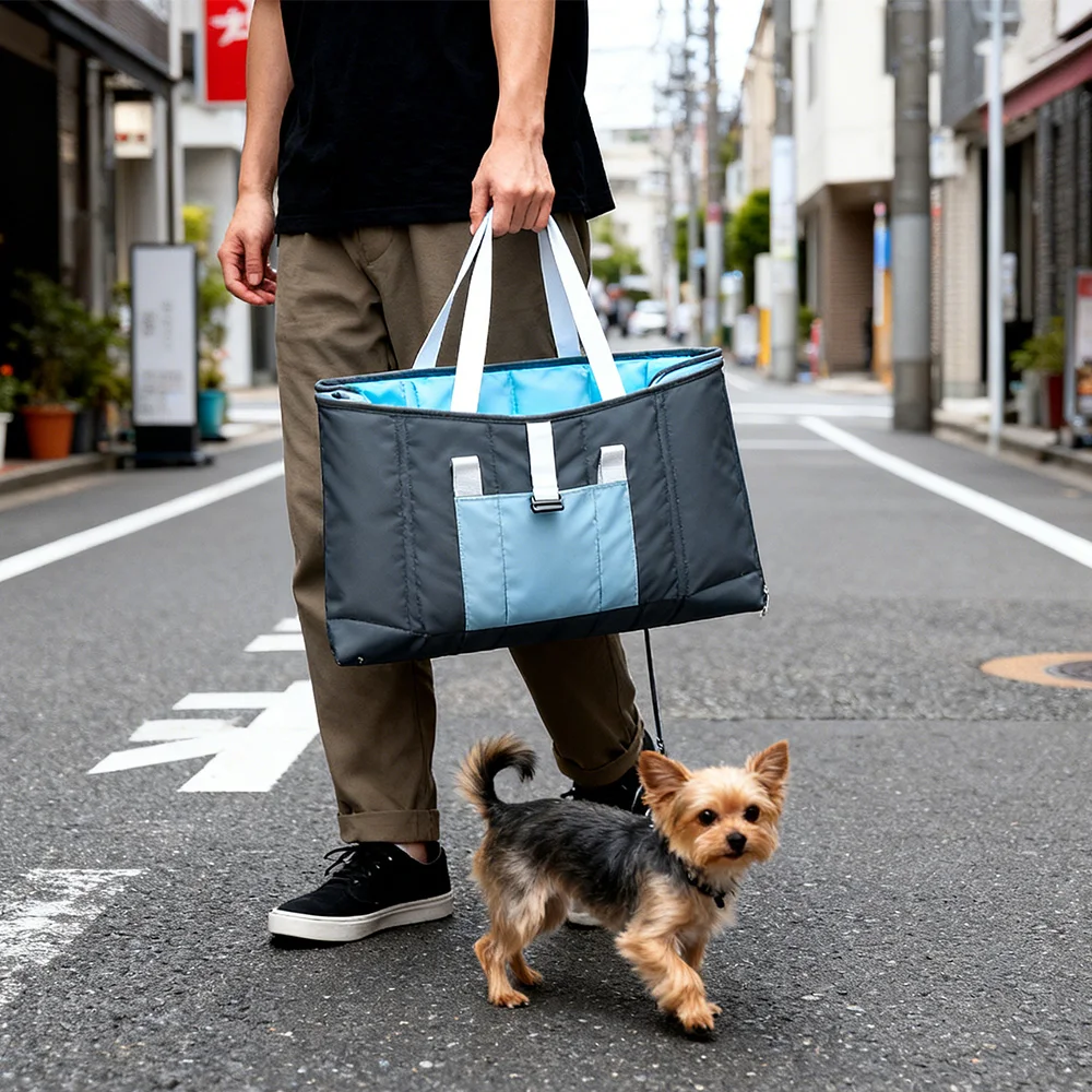 Cuando está plegada, es una bolsa para mascotas elegante y práctica.El cuerpo del bolso está fabricado con materiales duraderos y de alta calidad, con una apariencia simple y elegante.La combinación de gris y azul claro es hermosa y versátil.La correa de mano es resistente y suave, por lo que es fácil de transportar sin apretar las manos.Hay un amplio espacio dentro de la bolsa para acomodar juguetes, refrigerios, correas y otros artículos pequeños para mascotas, lo que le permite satisfacer las necesidades de su mascota en cualquier momento.