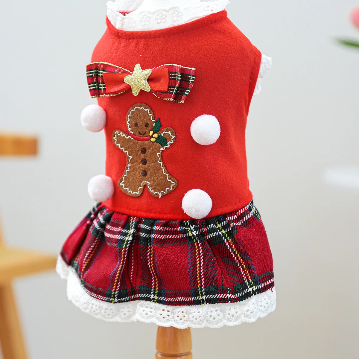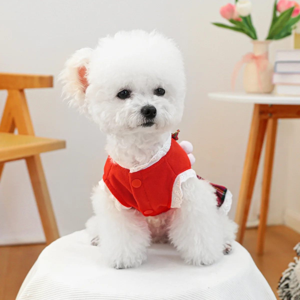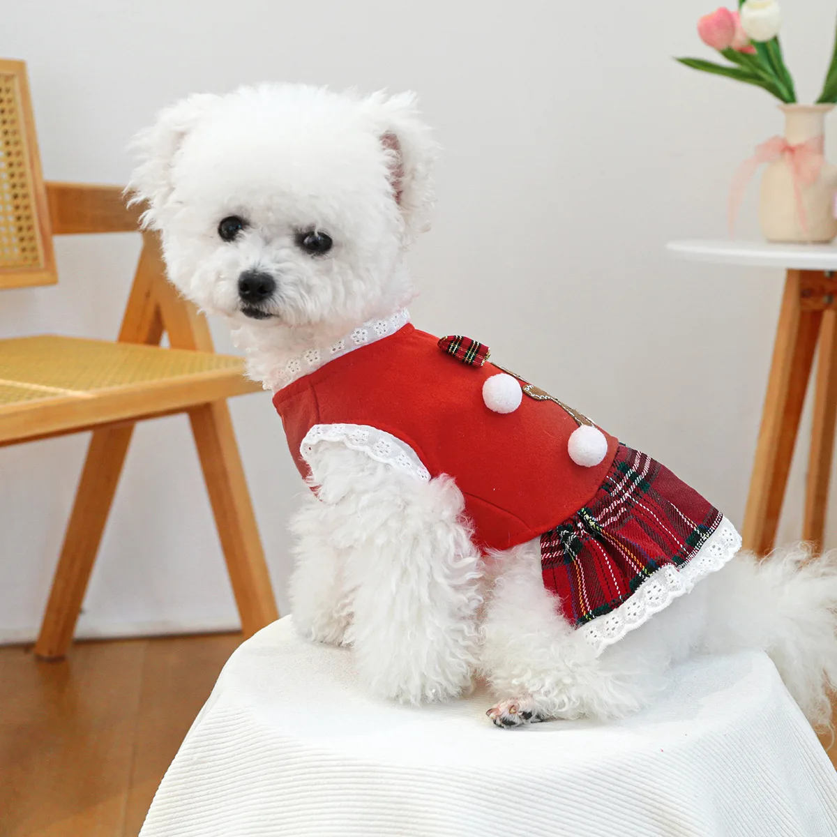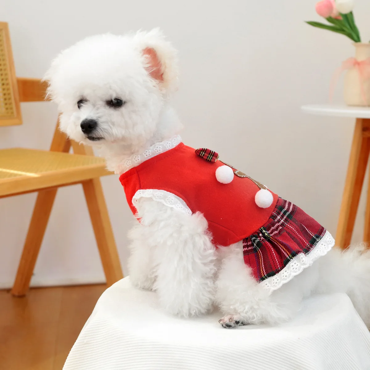 Vestido de encaje de felpa de Navidad para mascotas, abrigo de lana con falda a cuadros para perros y gatos pequeños