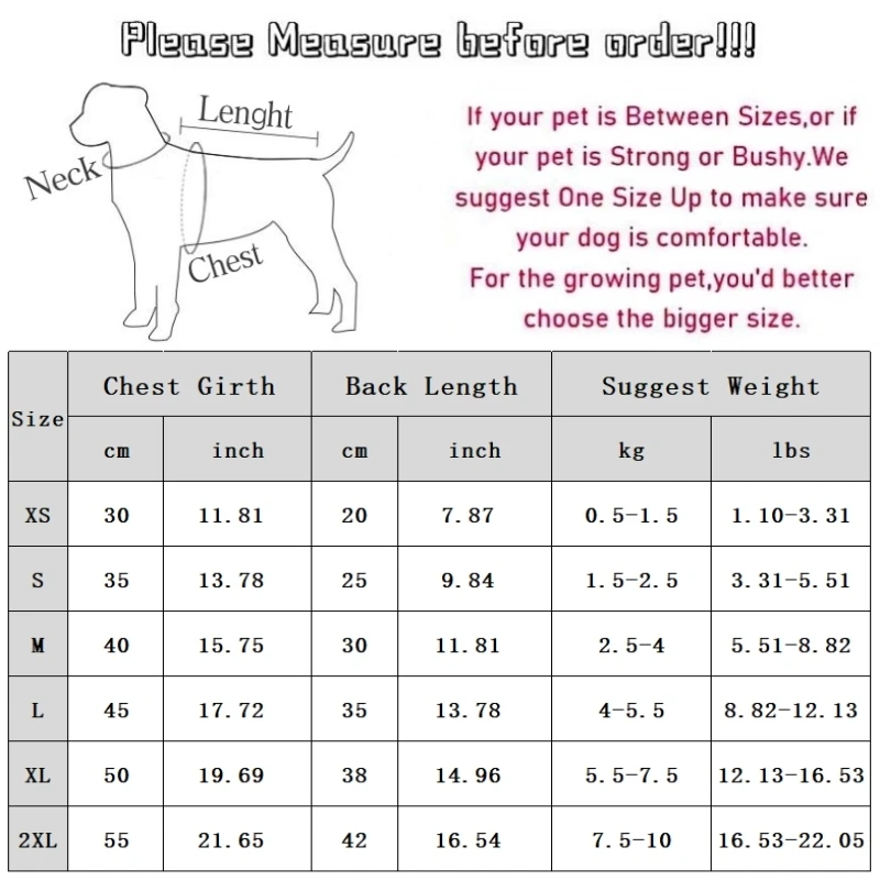 XXL: Longitud 42 cm/16,54 '' Pecho 55 cm/21,65 '' Peso sugerido 7,5-10 kg/16,5-22.05 libras