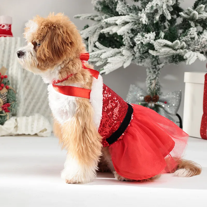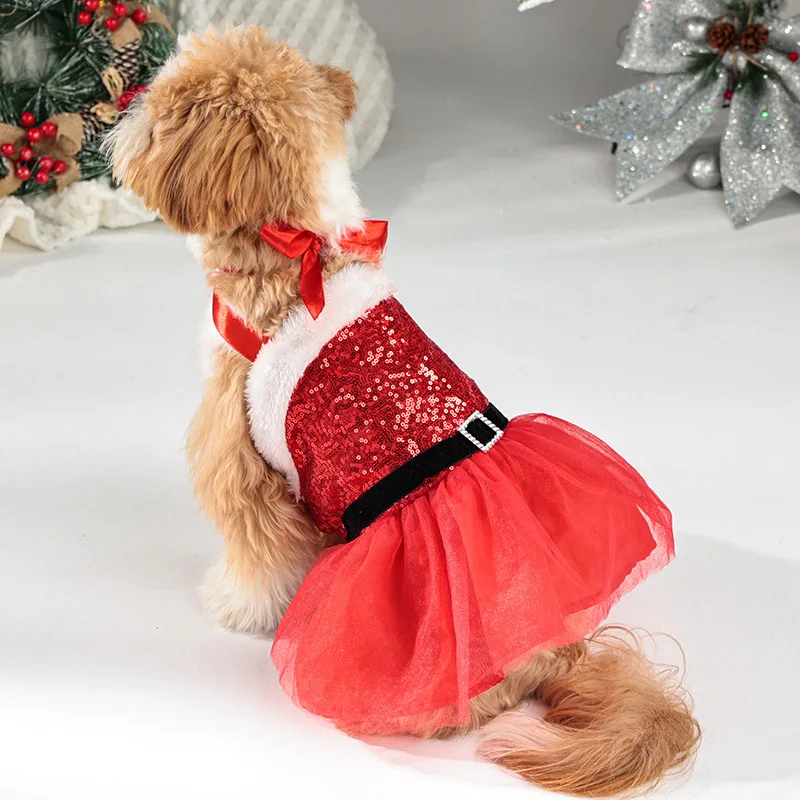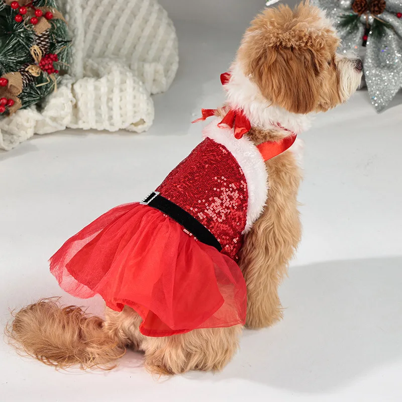 Vestido para perro con tutú de lentejuelas navideñas con diseño de lazo y cinturón, falda halter de terciopelo rojo, traje navideño para mascotas para perros pequeños/medianos,