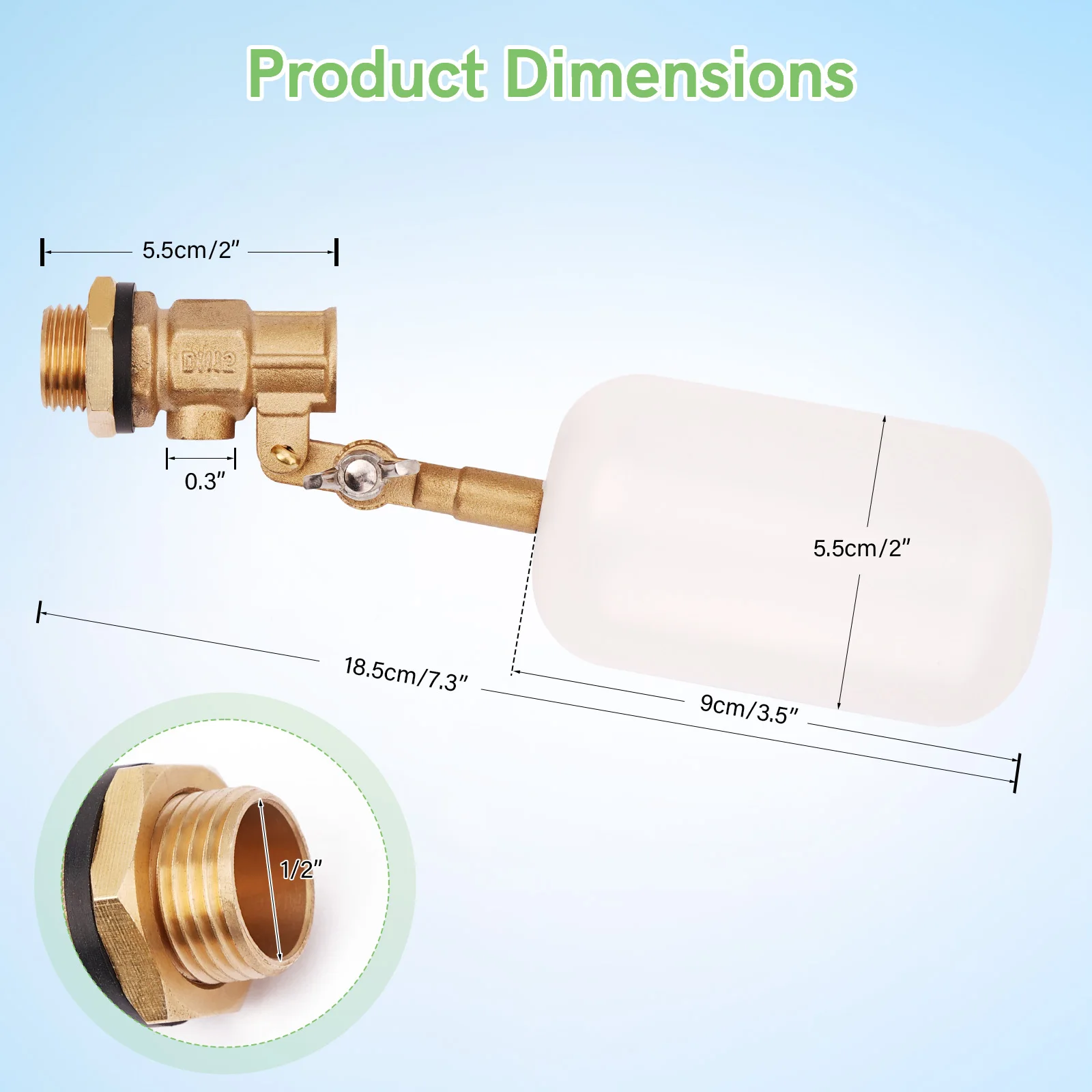 Dimensiones: La válvula de flotador utiliza roscas de tubería de 1/2 NPT; Esto es común en el mundo de la plomería y tiene un tamaño de rosca de aproximadamente 1/2 pulgada con arandelas estándar para eliminar fugas.La aplicabilidad supera la de las tradicionales válvulas de flotador metálico.