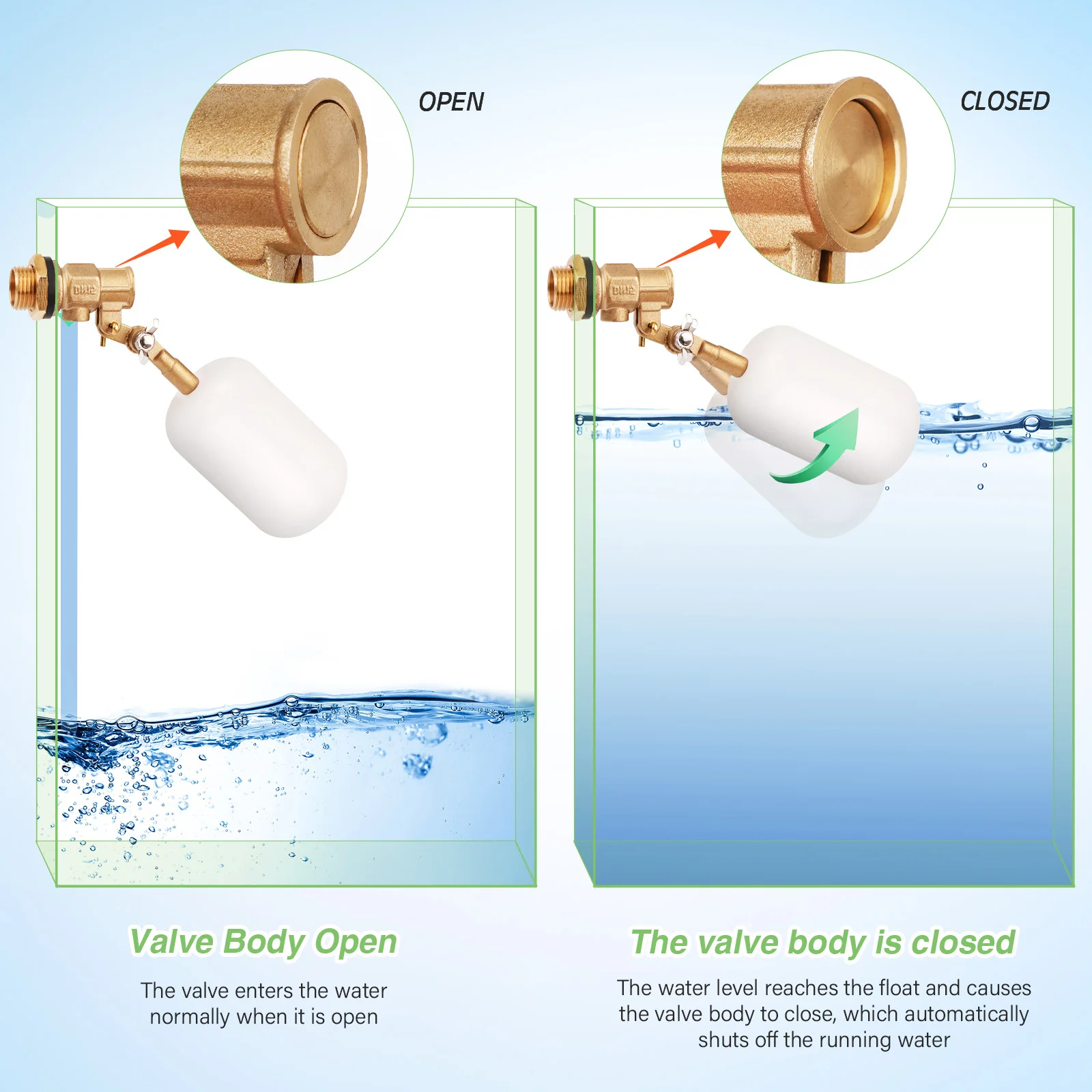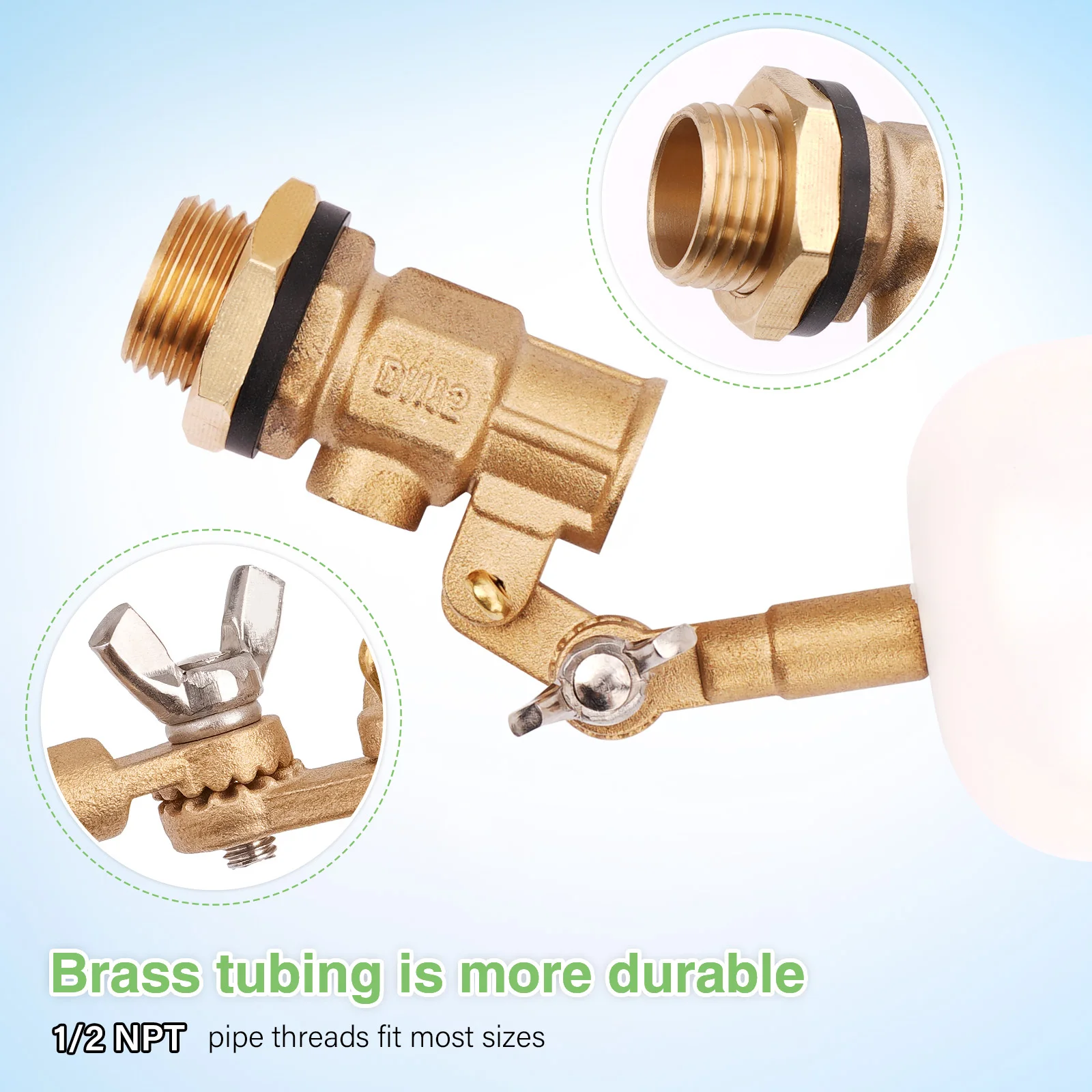 Brazo ajustable: La válvula flotante tiene un brazo ajustable que se puede ajustar más de 180 grados para adaptarse a diferentes niveles de agua.No requiere fuente de energía ni bomba, apretado a mano para un funcionamiento sin fugas.