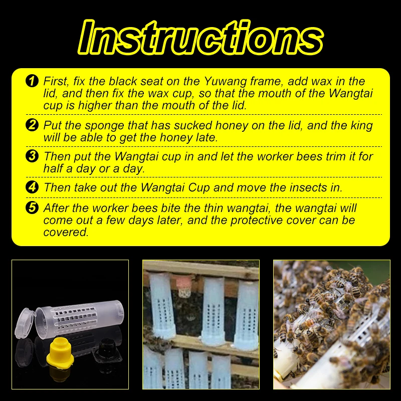 Instrucciones:1.Inserta la caja del peine en un marco y en su parte posterior hay 110 vasos de arranque de celdas marrones.(Con este kit podrás criar tus propias reinas y hacerlo sin injertar ni amar tocar larvas).2.Luego confinas la reina en el frente de la jaula y inmediatamente coloca huevos en las 110 células disponibles.Se puede lanzar al día siguiente.El cuarto día cada larva recién hacha está lista para su transferencia.3.Quitarás cada taza inicial de celda e la insertas en un portavasos de celda (no incluido).4.Luego, puede deslizar esta unidad sobre un soporte de barra celular que se conecta a una barra celular (no incluida).5.Para terminar las células, ahora coloca la barra celular en una colonia de edificio celular.