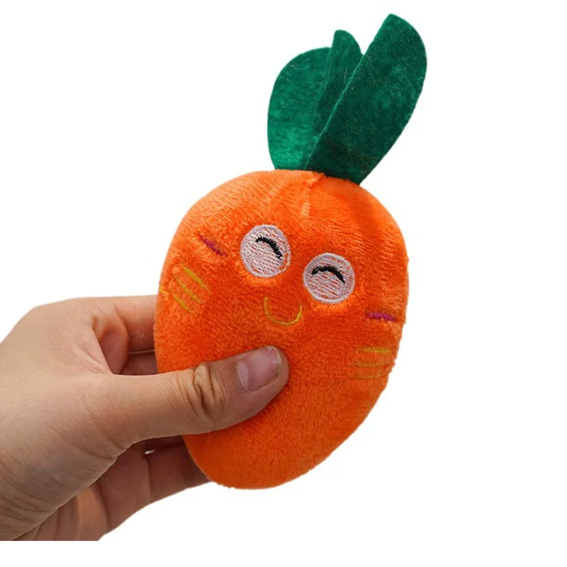 Vocalizador interior: los juguetes de peluche de zanahoria son bolsas vocales incorporadas, por lo que emitirán un sonido chirriante cuando los perros los piquen, lo que puede captar fácilmente la atención de la mascota y permitirle jugar felizmente.