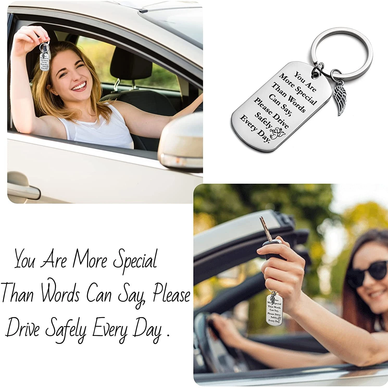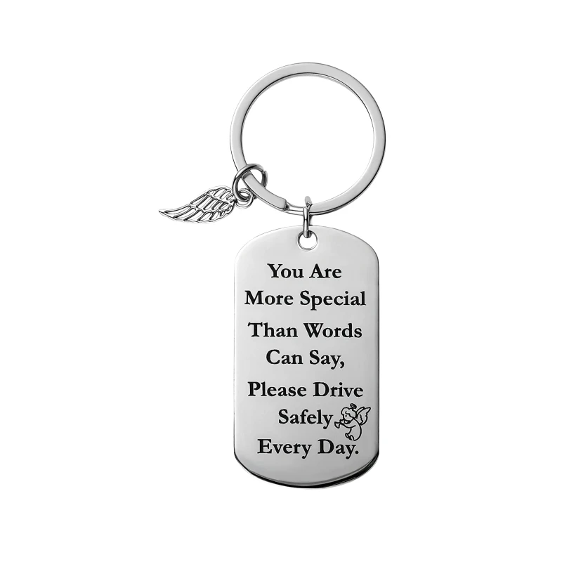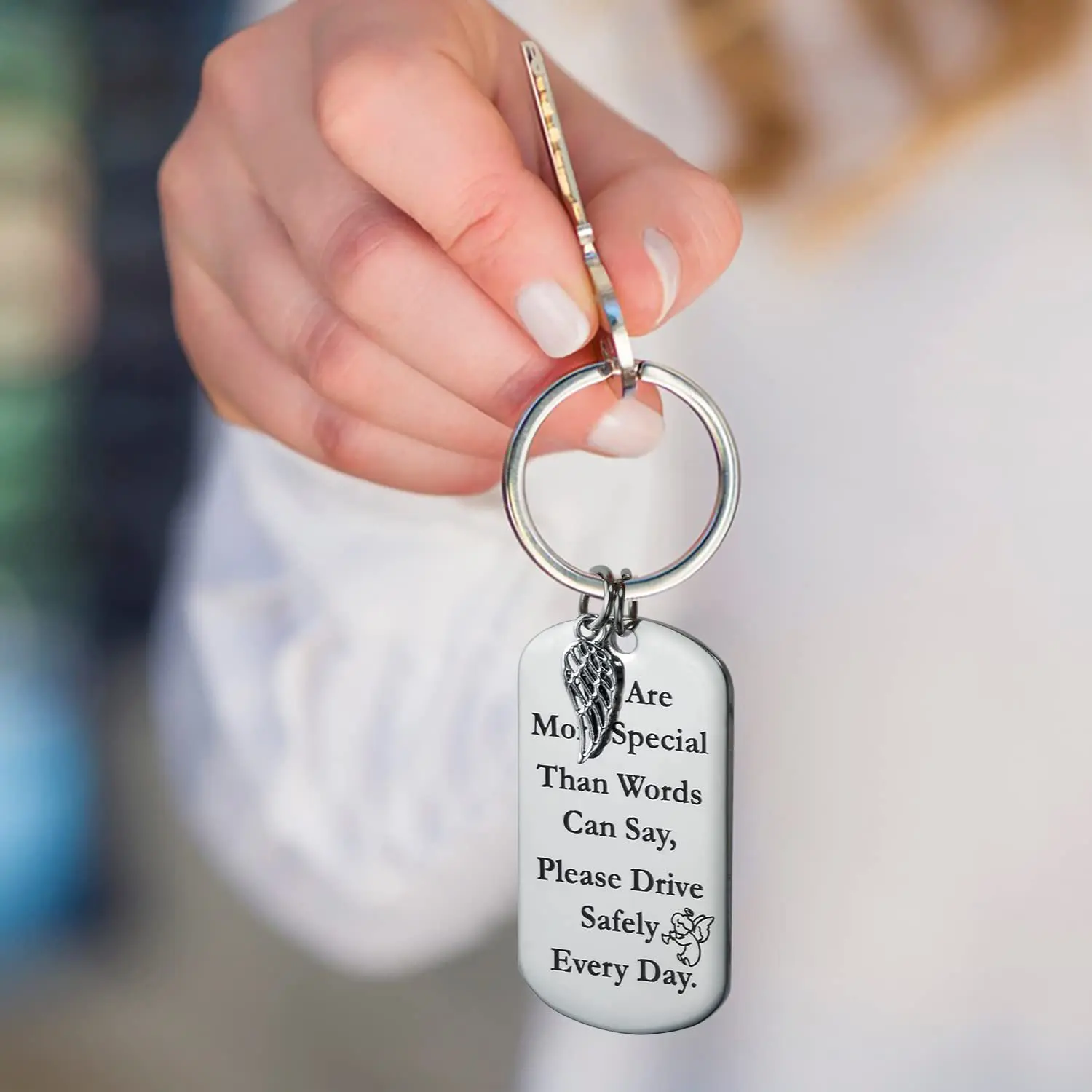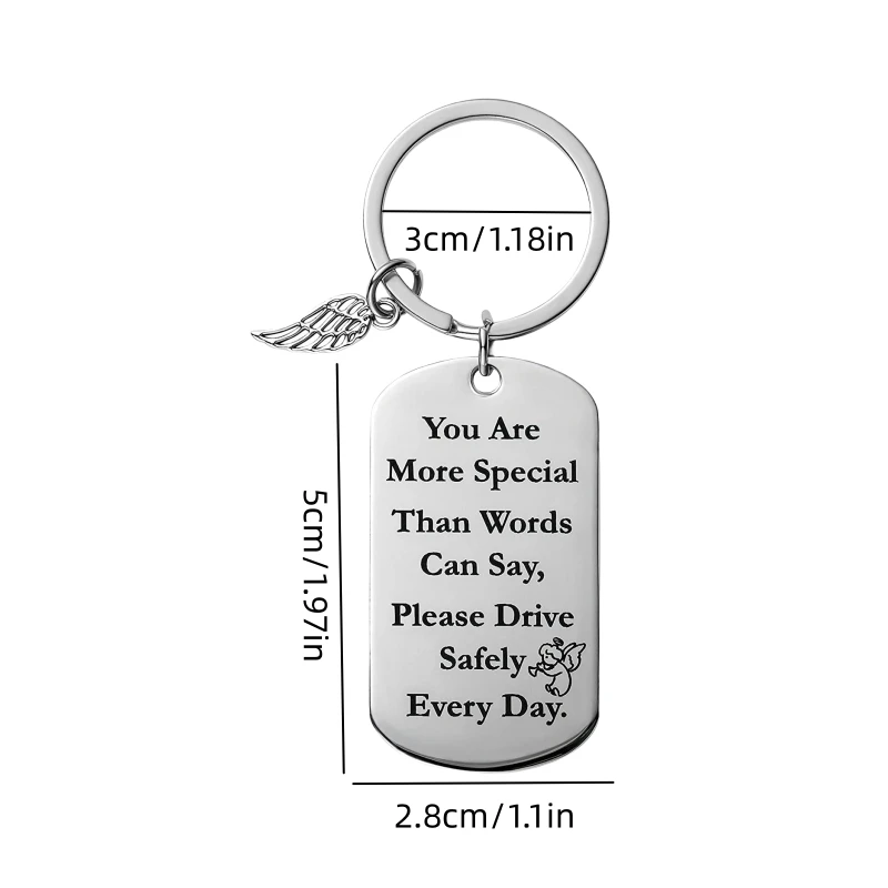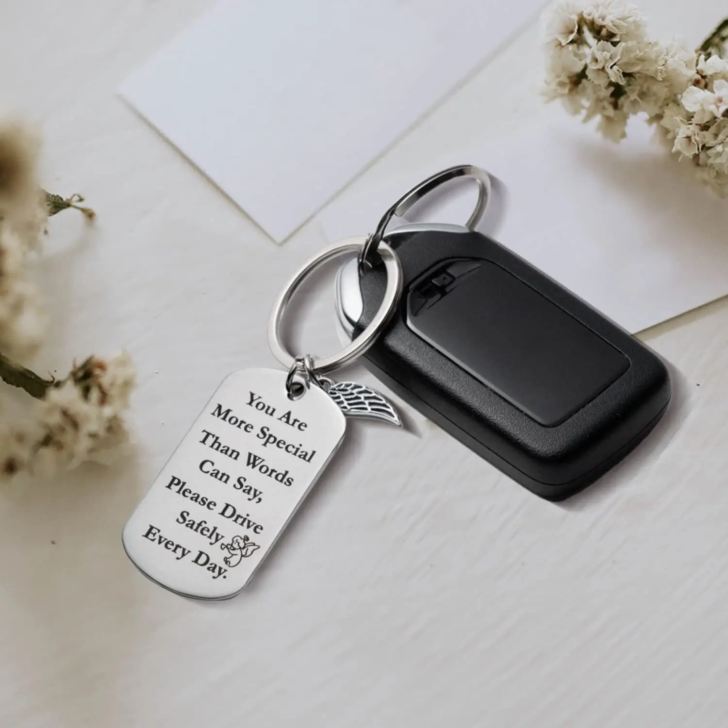 1 unidad "Eres más especiales que las palabras pueden decir, por favor conduzca con seguridad todos los días" llavero de acero de titanio regalo de conducción segura