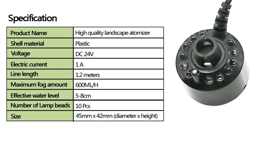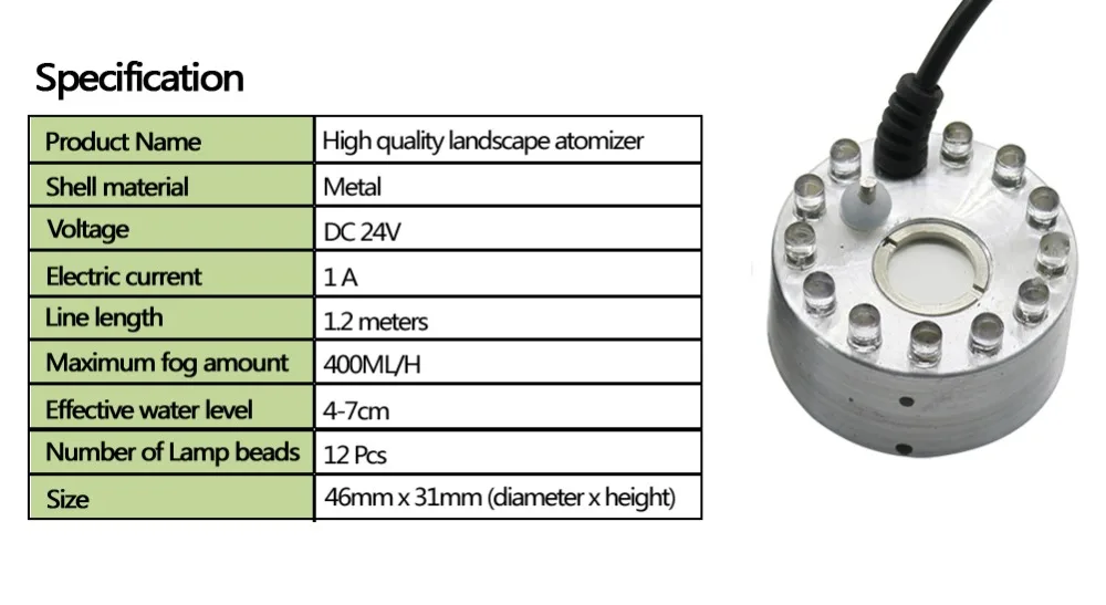 Detalles del atomizador de metal: Nombre del producto: Atomizador 12 LED de alta calidad Material de la carcasa: Metal Voltaje: DC 24V Corriente eléctrica: 1A Longitud de la línea: 1,2 metros Cantidad máxima de niebla: 400 ML/H Nivel de agua efectivo: 4 ~ 8cm Tamaño: 46mm x 31mm (diámetro x altura) Número de cuentas de lámpara: 12 piezas Detalles del atomizador de plástico: Nombre del producto: Atomizador 12 LED de alta calidad Material de la carcasa: plástico Voltaje: DC 24V Corriente eléctrica: 1A Longitud de la línea: 1,2 metros Cantidad máxima de niebla: 600 ML/H Nivel efectivo del agua: 5 ~ 8cm Tamaño: 45mm x 42mm (diámetro x altura) Número de cuentas de lámpara: 12 piezas El embalaje incluye (dos productos se venden por separado): 1 Unidad x atomizador de 12 LED de metal O 1 Unidad x atomizador de plástico 12 LED Características: El atomizador es ampliamente utilizado, incubadoras, alimentación de animales, se puede combinar con Rocalla, bonsái, etc. para usar con manualidades, macetas de plástico también se pueden usar en casa, lavabos y otros recipientes ordinarios, que producen efectos fantásticos, spray humidificador para estanques de jardinería de interior y exterior, artesanías de Acuario, Macetas decorativas y otras artes aportan una nueva vitalidad, que le da un noble, elegante, como un país de las maravillas del espacio natural también se utiliza en varias casas industriales y orquídeas, etc humidificación. Actualización: Nuestro chip cerámico nebulizador utiliza la última tecnología, el electrodo de atomización en comparación con el níquel convencional o el titanio, el electrodo de protección especial del chip cerámico en resistencia a ácidos y álcalis, el rendimiento de cavitación a la corrosión es superior, teniendo una fuerza de electrodo alta y difícil de escalar, las características reales de larga vida. Aviso: El tamaño se mide a mano, por favor permita un pequeño error de medición. El color de la foto puede ser un poco diferente del producto real debido a la visualización a color de diferentes monitores.
