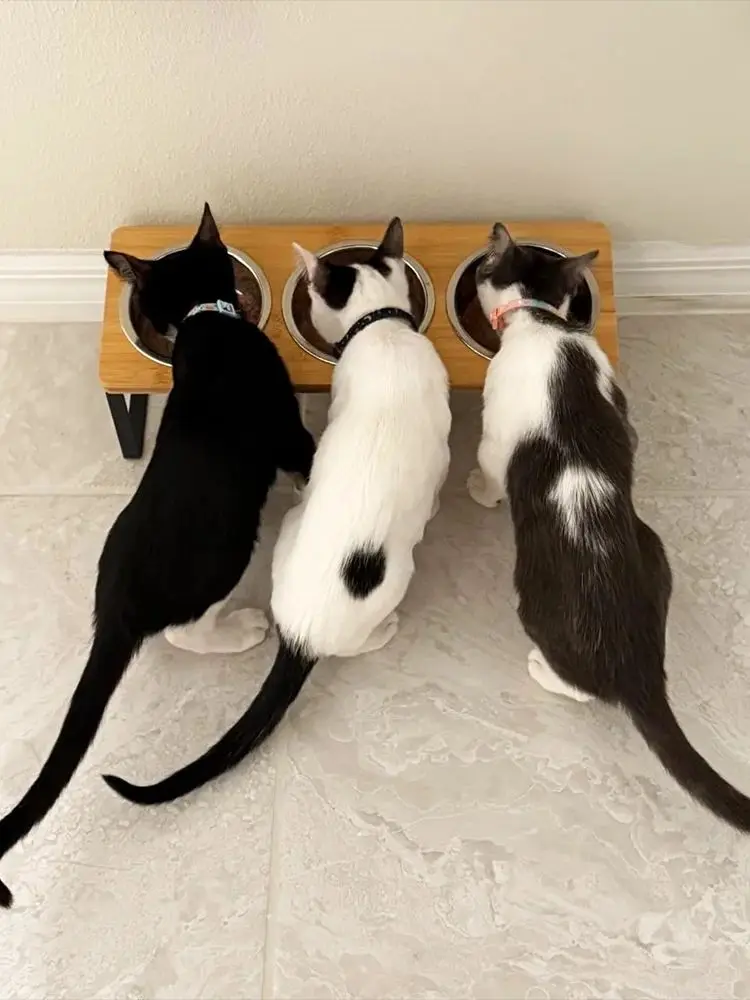 Nuestros tazones de comida para gatos están inclinados en un ángulo de 15° evita el desbordamiento del lavabo de agua. El diseño inclinado también promueve una mejor digestión y absorción de nutrientes y 3 tazones para gatos les brindan una opción de alimento adicional.