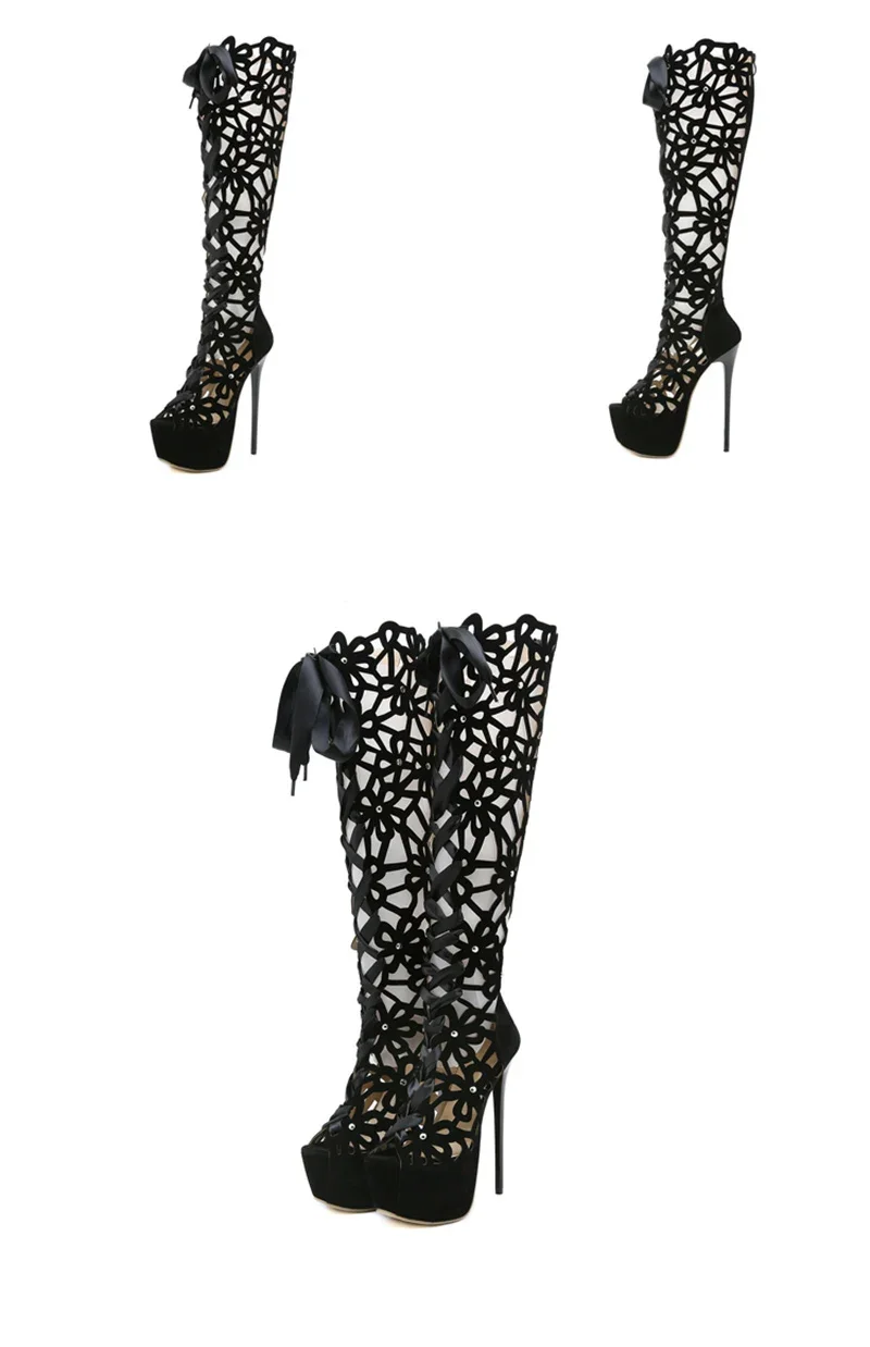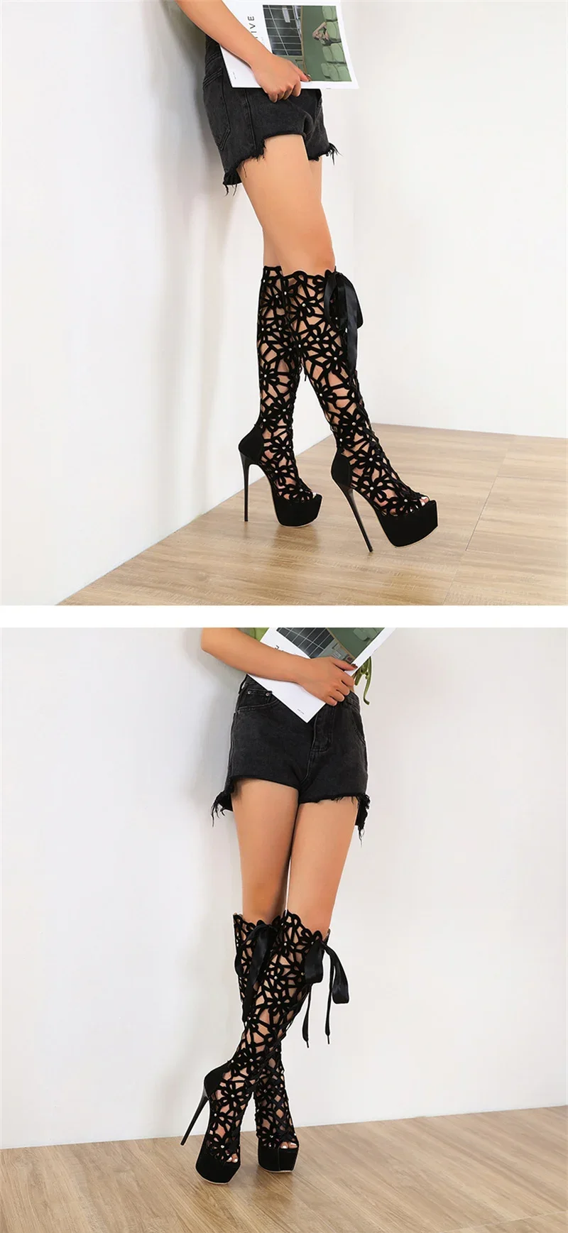 16CM tacones altos ultrafinos Sexy club nocturno ahueca hacia fuera las botas por encima de la rodilla mujeres Peep Toe con cordones Zip zapatos de plataforma sandalias