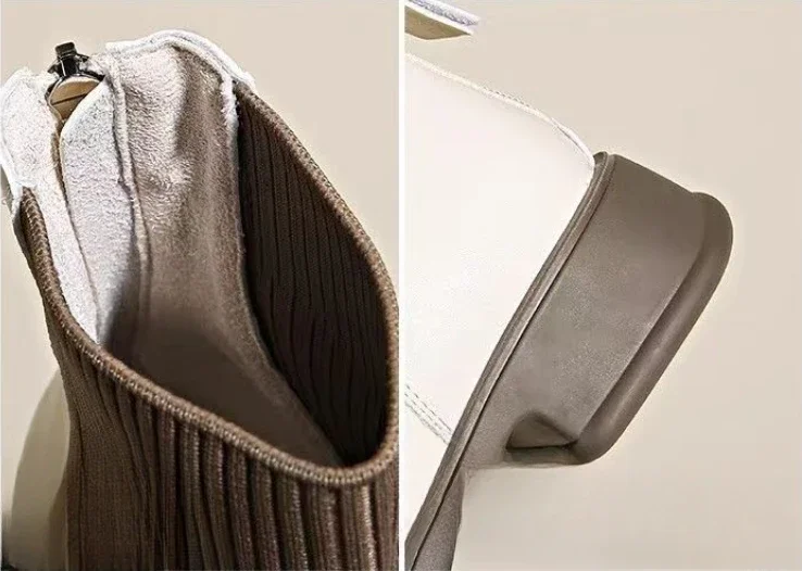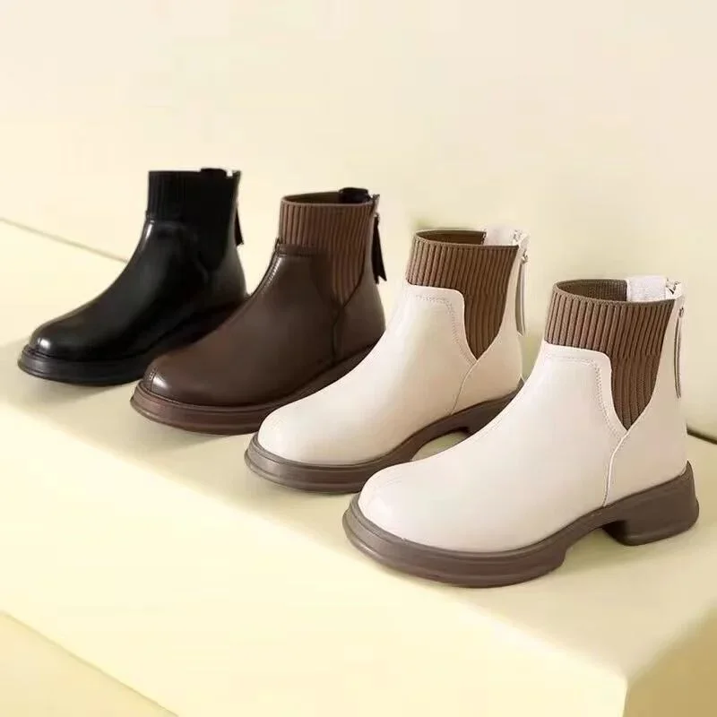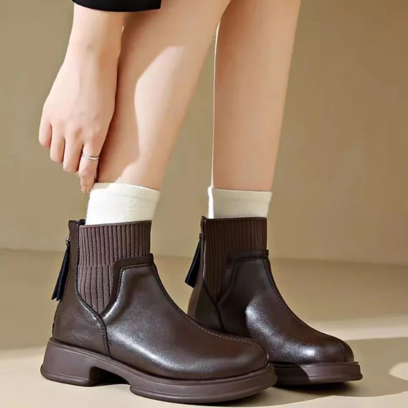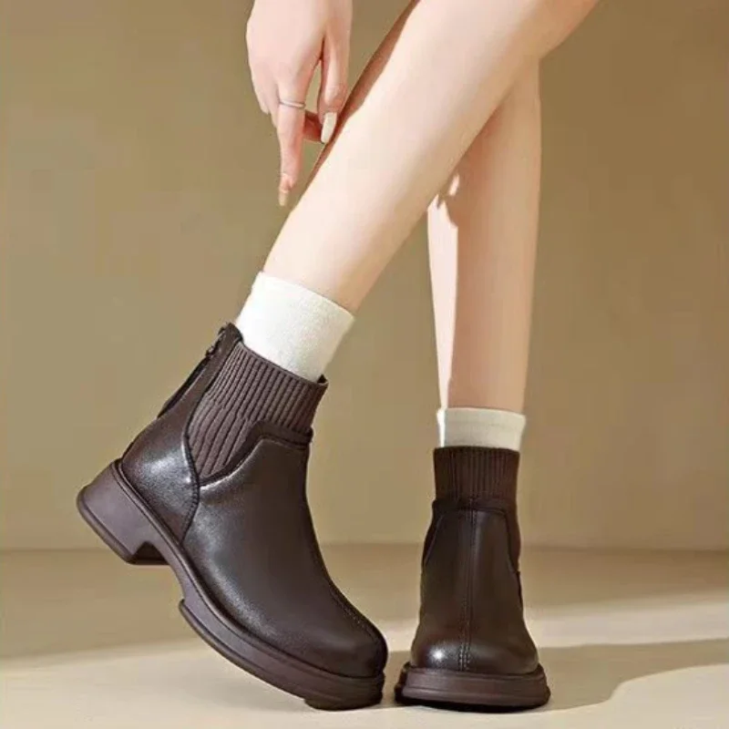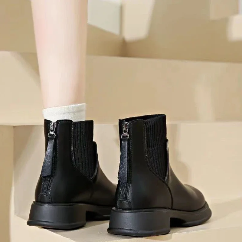 2024 Black Women Shoes Short Boots Women Genuine Leather Splicing Round Toe Slip-On Boots Woman Comfy Flat Chelsea Boots Woman