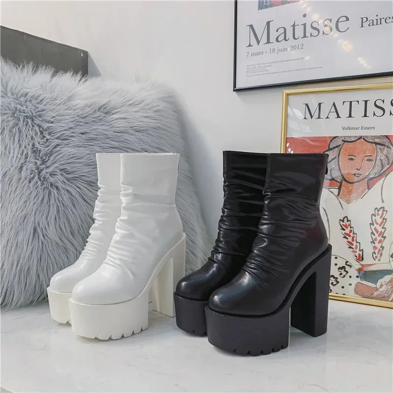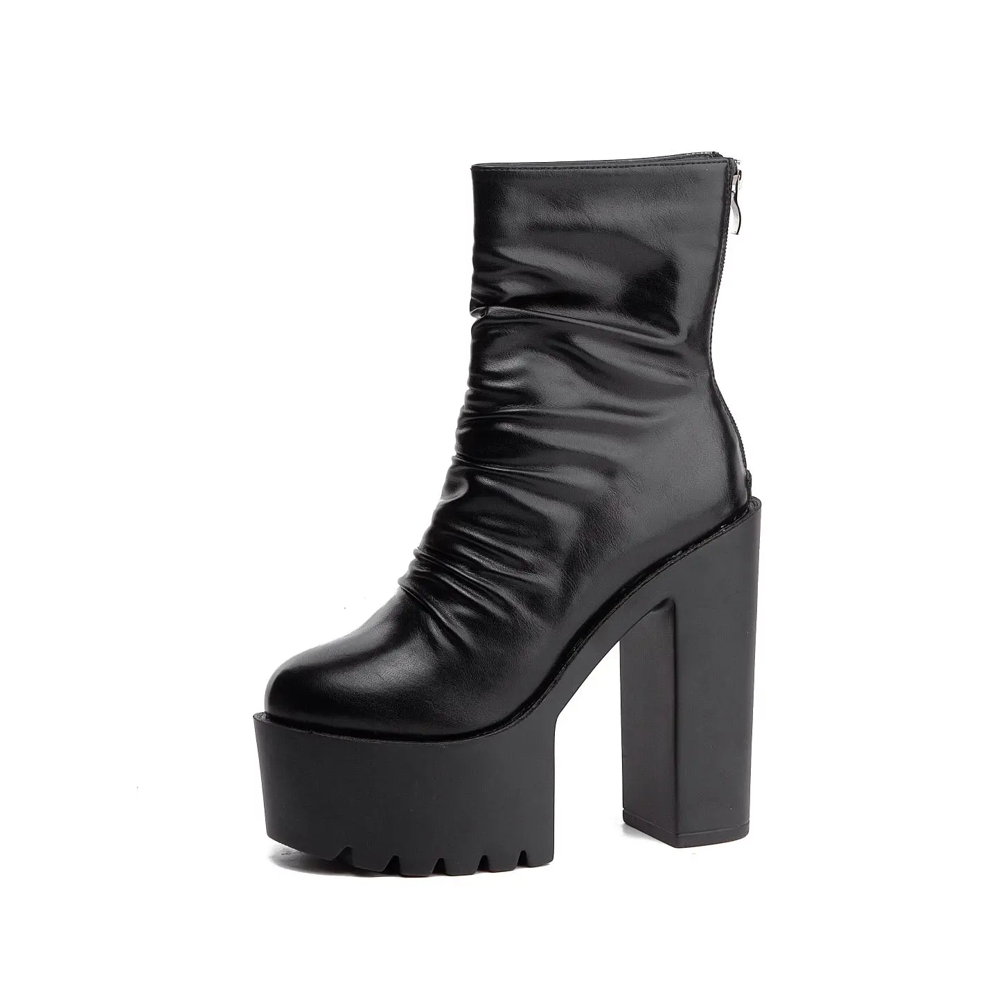 2025 Botas de invierno para mujer, plataforma impermeable, superficie plegable, cremallera, tacón grueso, botas cortas, zapatos casuales de moda