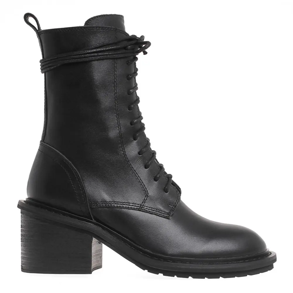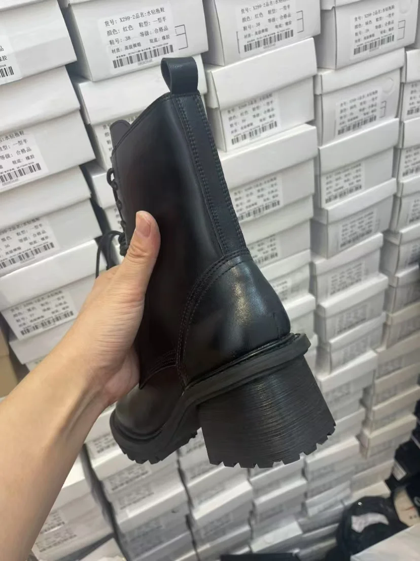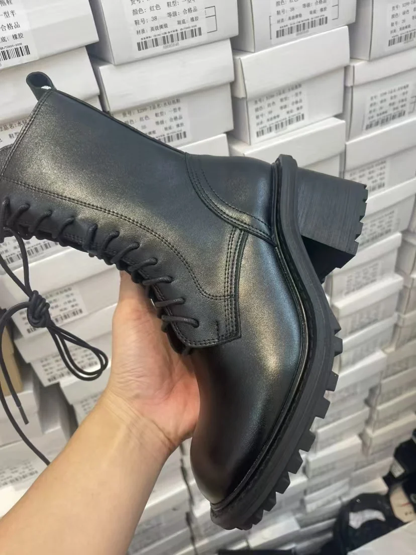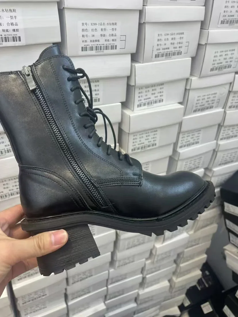 2025 marca de invierno de alta calidad Chic Cool botines de mujer moda negro tacones de bloque con cordones cremallera motocicletas botas zapatos