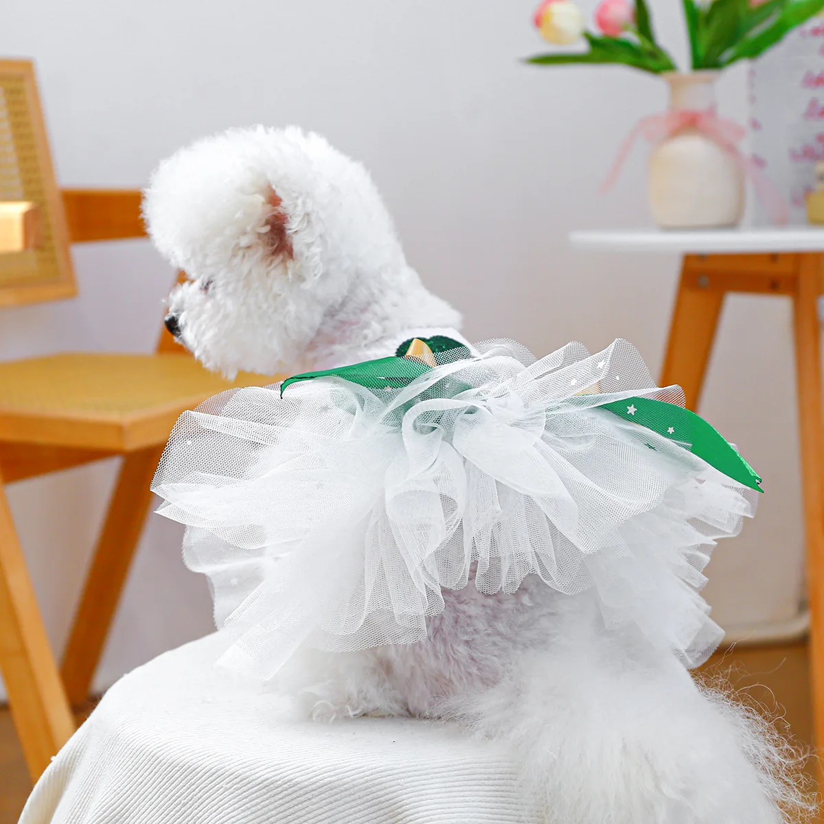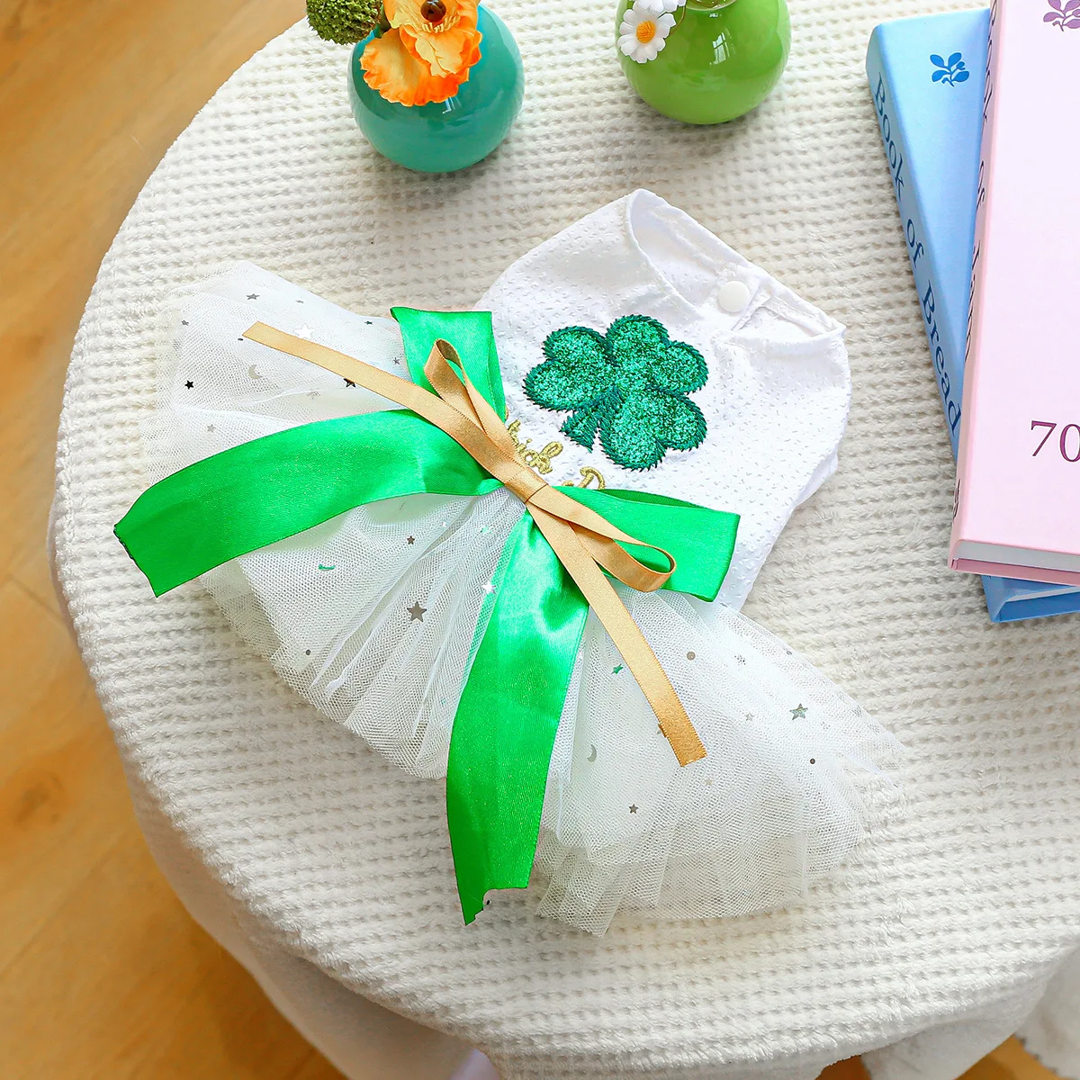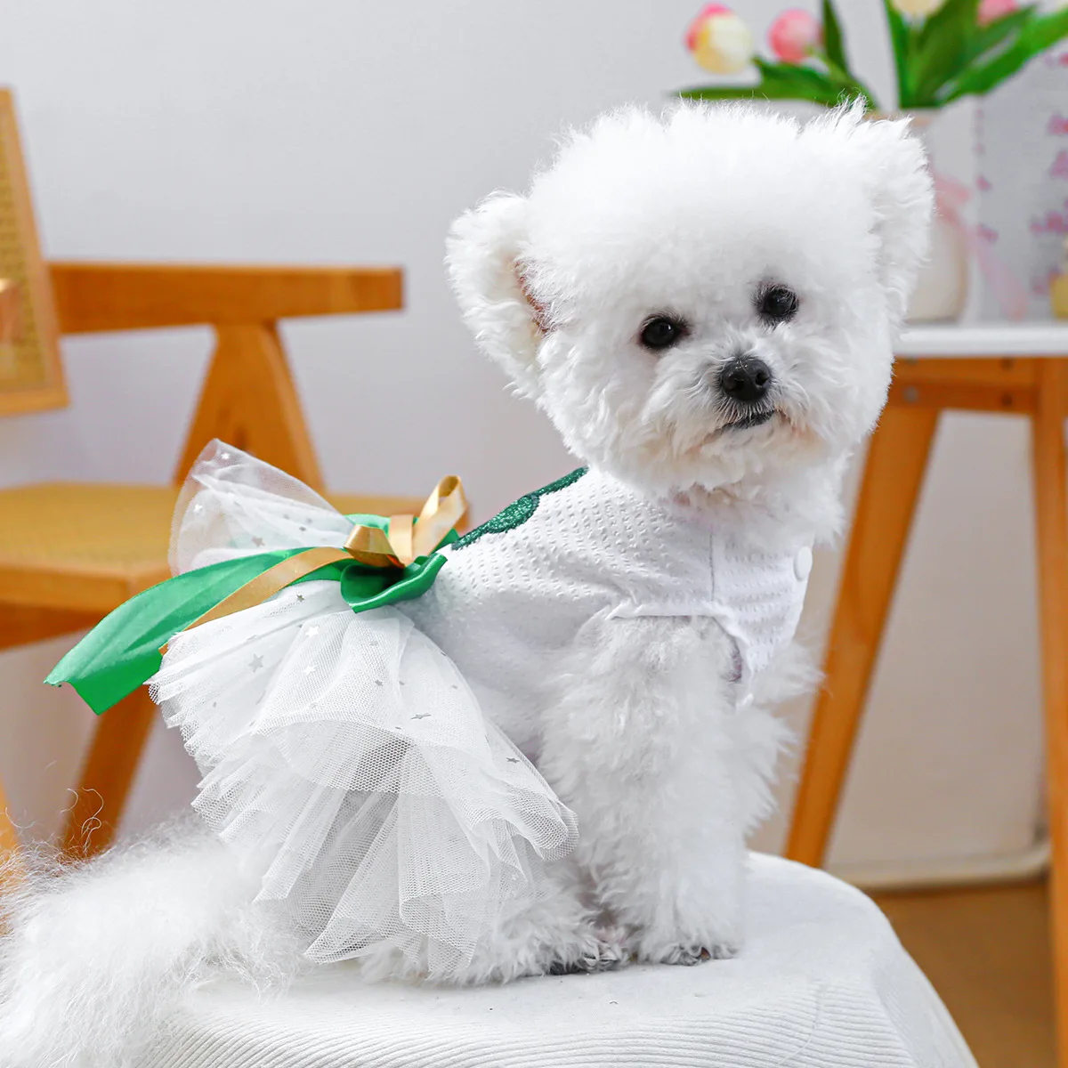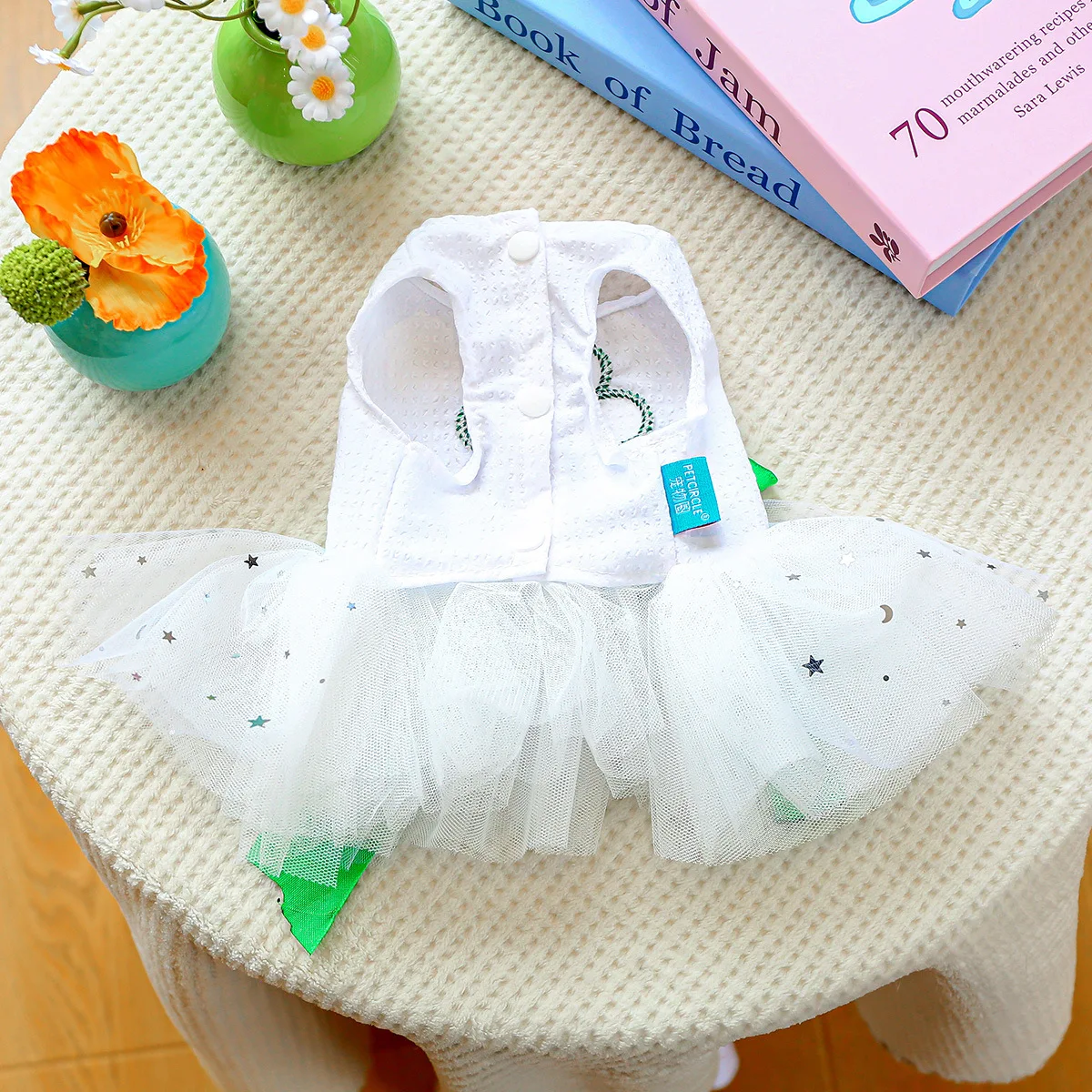 2025 Ropa de primavera/verano Vestido de princesa de tul blanco para perros Diseño único de trébol para perros pequeños Bichon Chihuahua, maltés