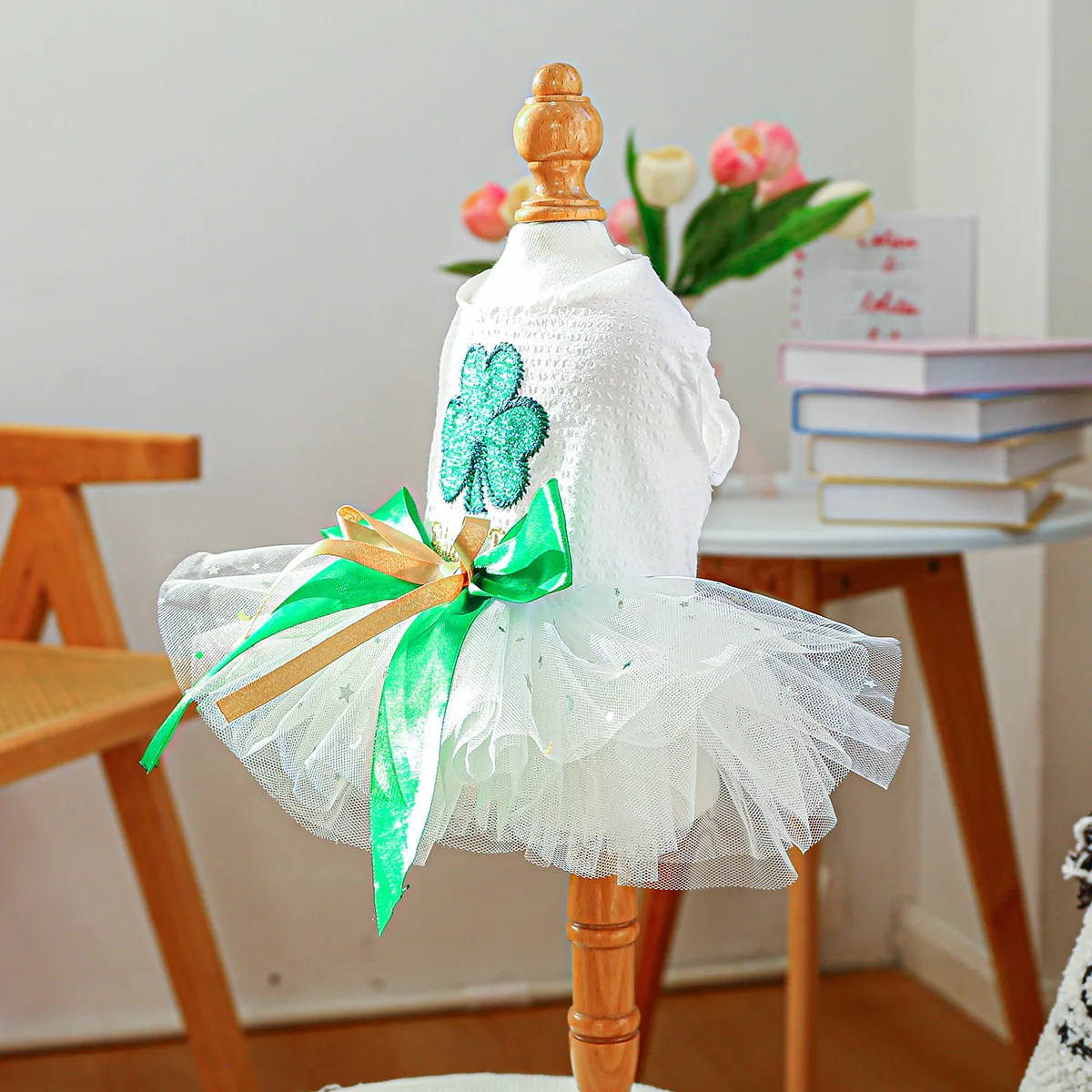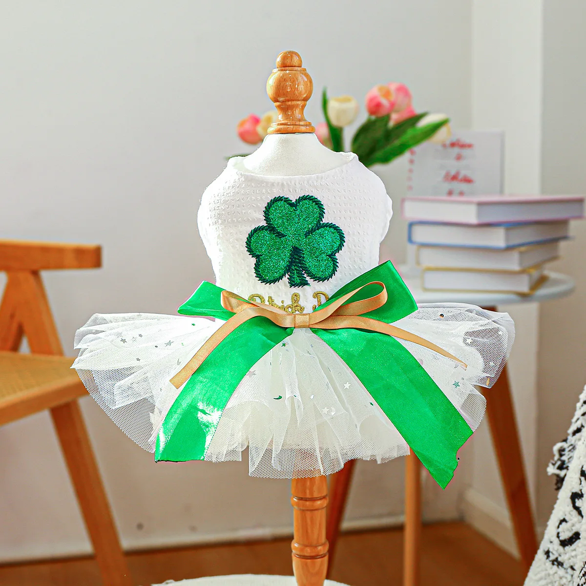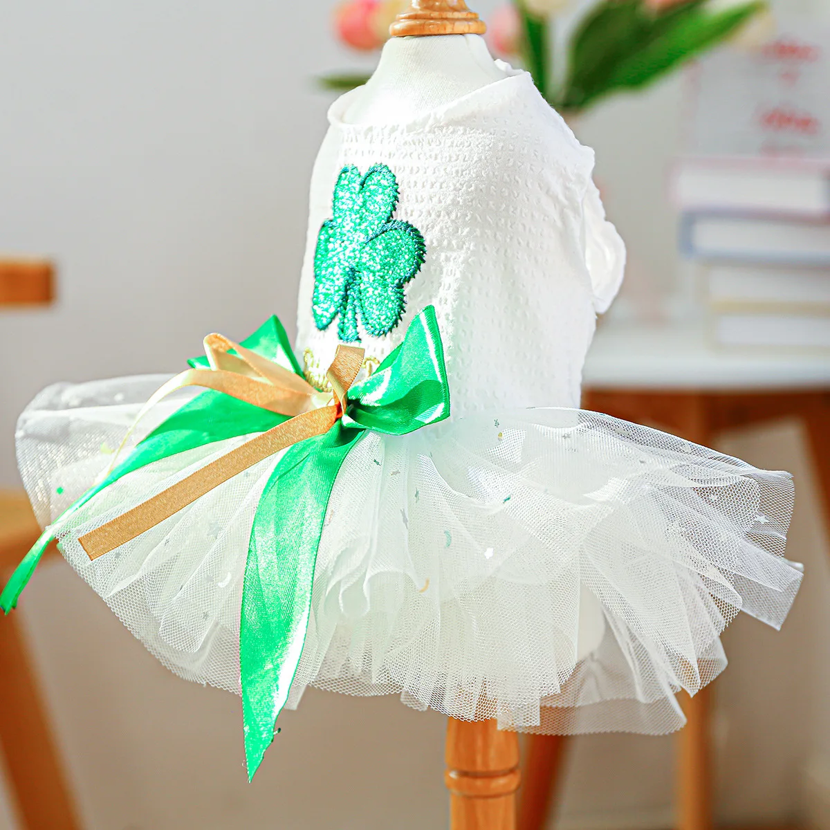 2025 Ropa de primavera/verano Vestido de princesa de tul blanco para perros Diseño único de trébol para perros pequeños Bichon Chihuahua, maltés