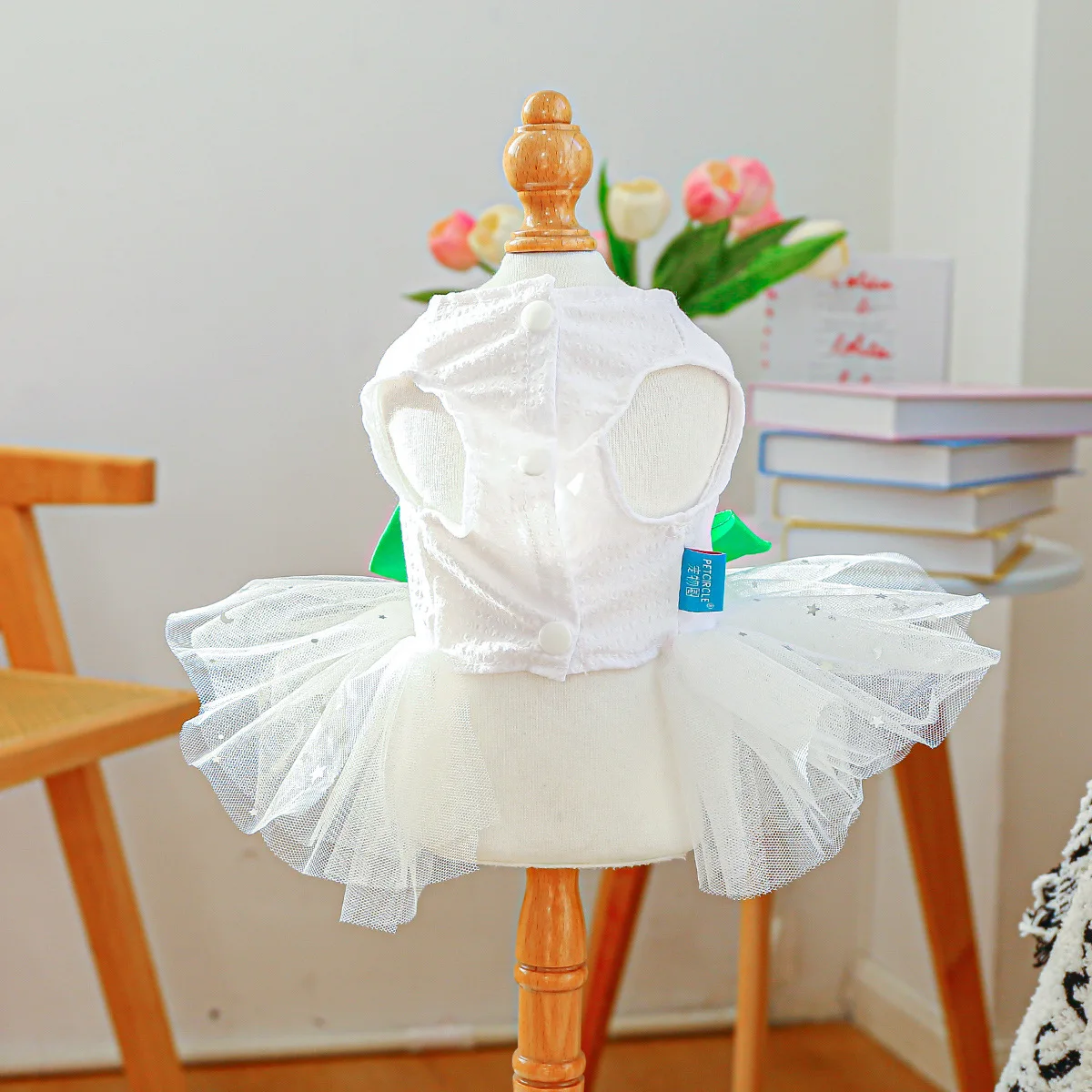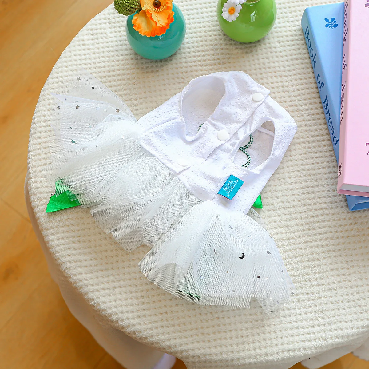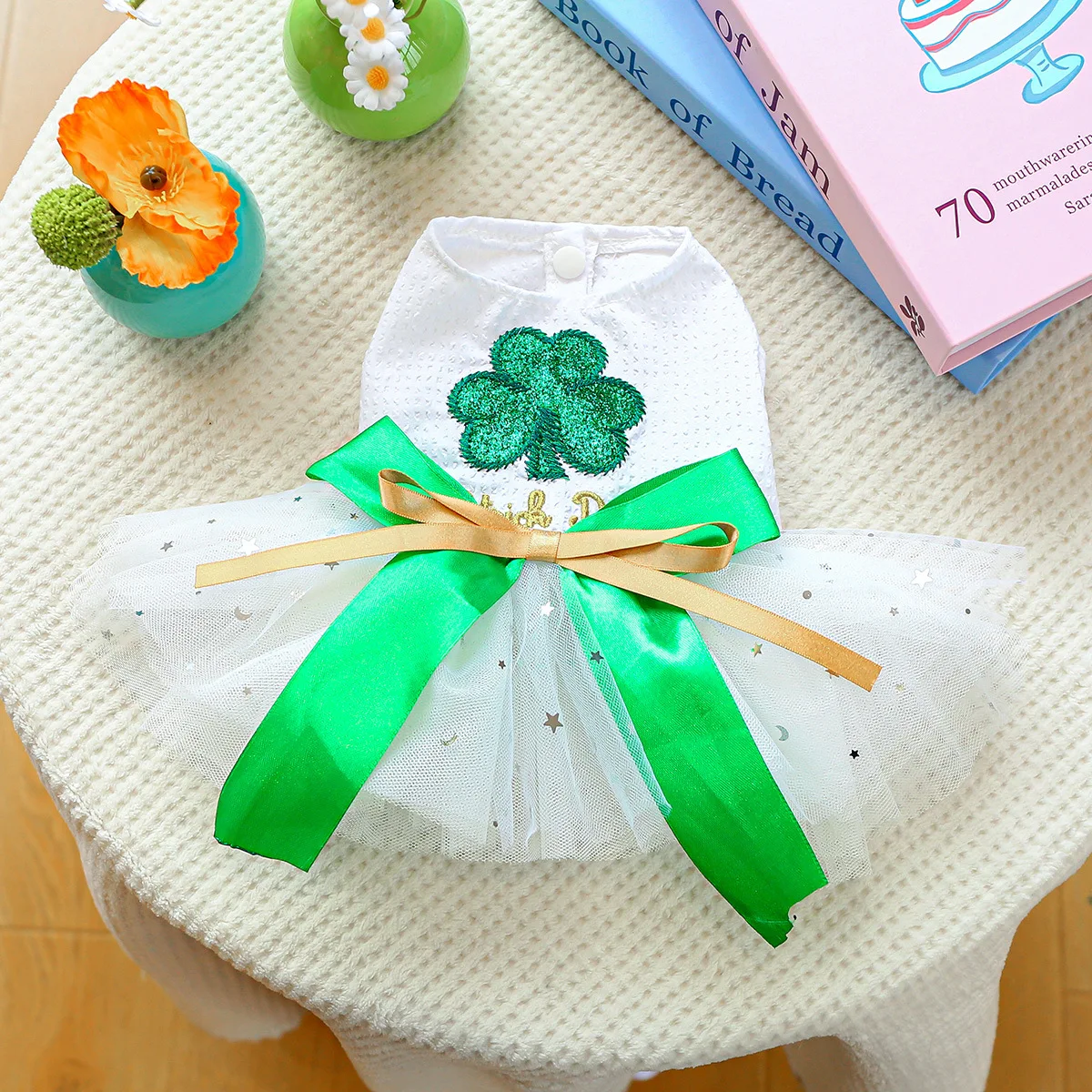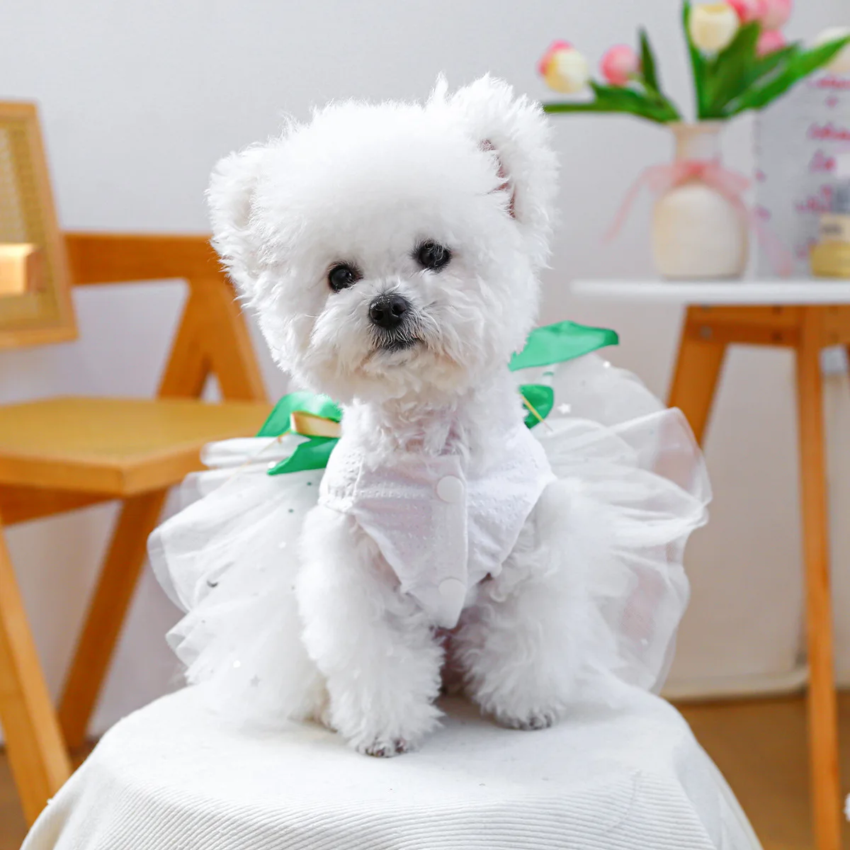 2025 Ropa de primavera/verano Vestido de princesa de tul blanco para perros Diseño único de trébol para perros pequeños Bichon Chihuahua, maltés