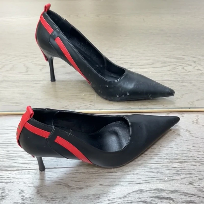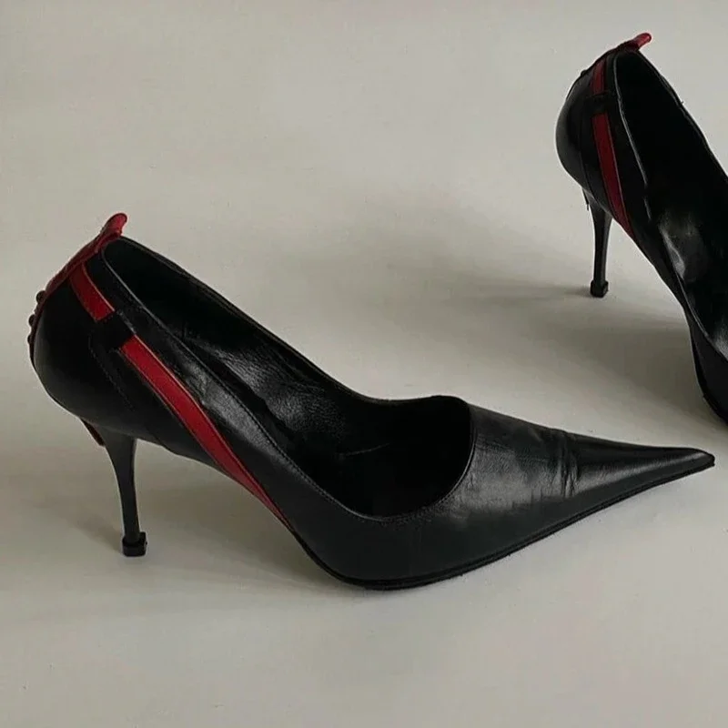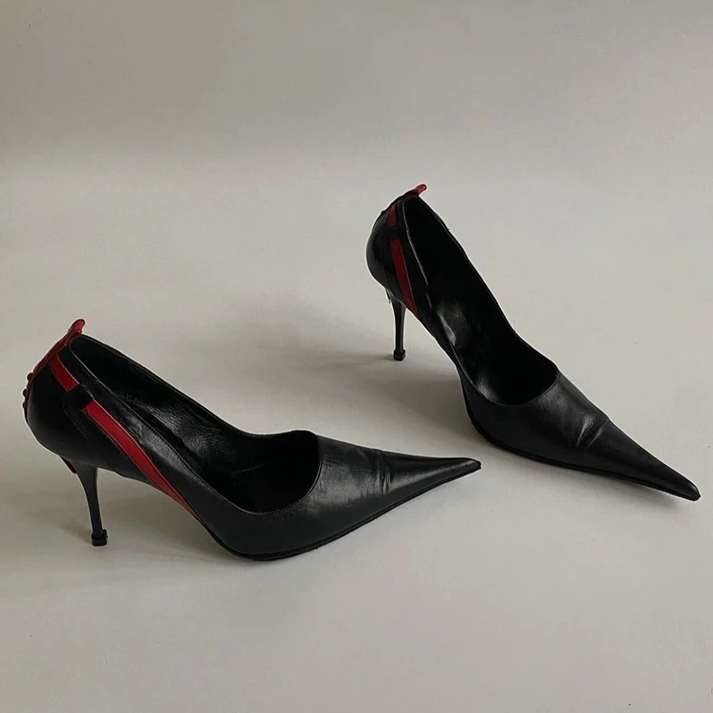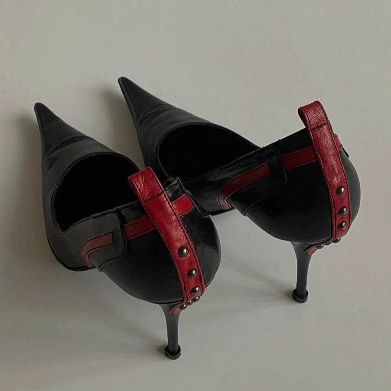 2025 zapatos de mujer con decoración de remaches de aguja con punta estrecha, zapatos de mujer romanos negros y rojos a la moda, zapatos sin cordones hechos a mano