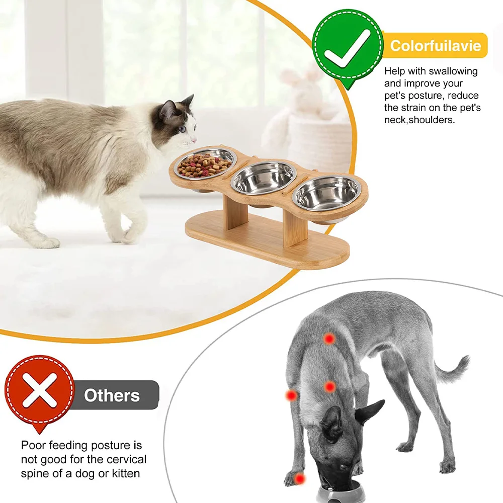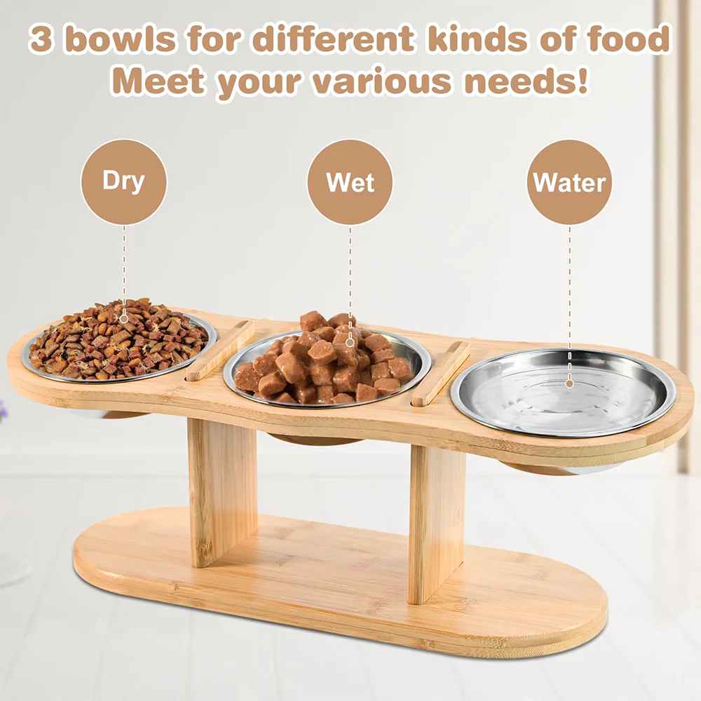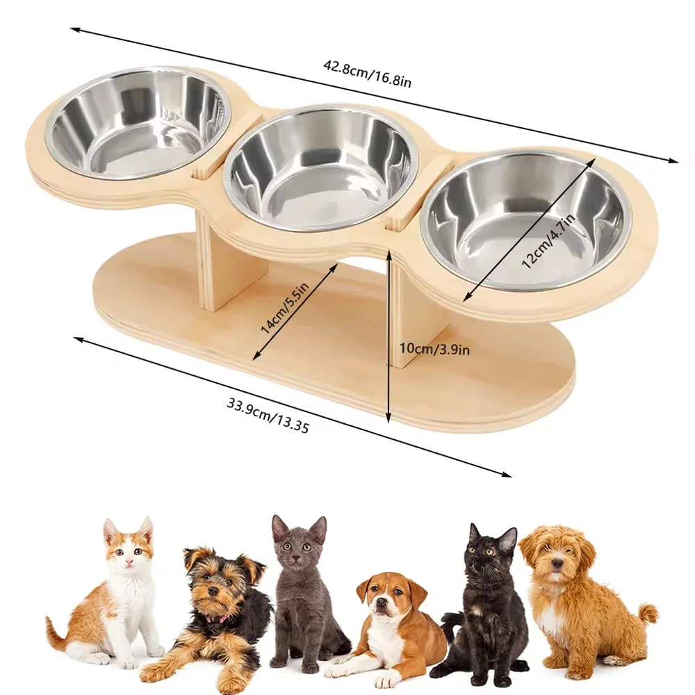 3 tazones de acero inoxidable, comedero elevado para mascotas, Base de madera antirretroceso para perros pequeños, tazones de comida/agua para mascotas pequeñas