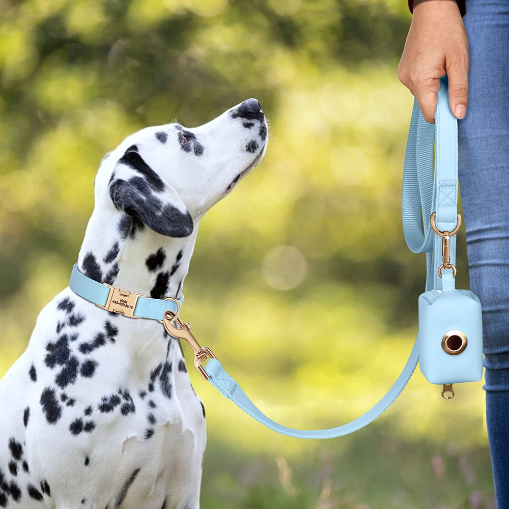 3 unids/lote, conjunto de bolsa con correa para Collar de perro, collares personalizados para perros, collar con hebilla de cuero PU personalizado para mascotas con bolsa de excrementos de plomo para perros Pug
