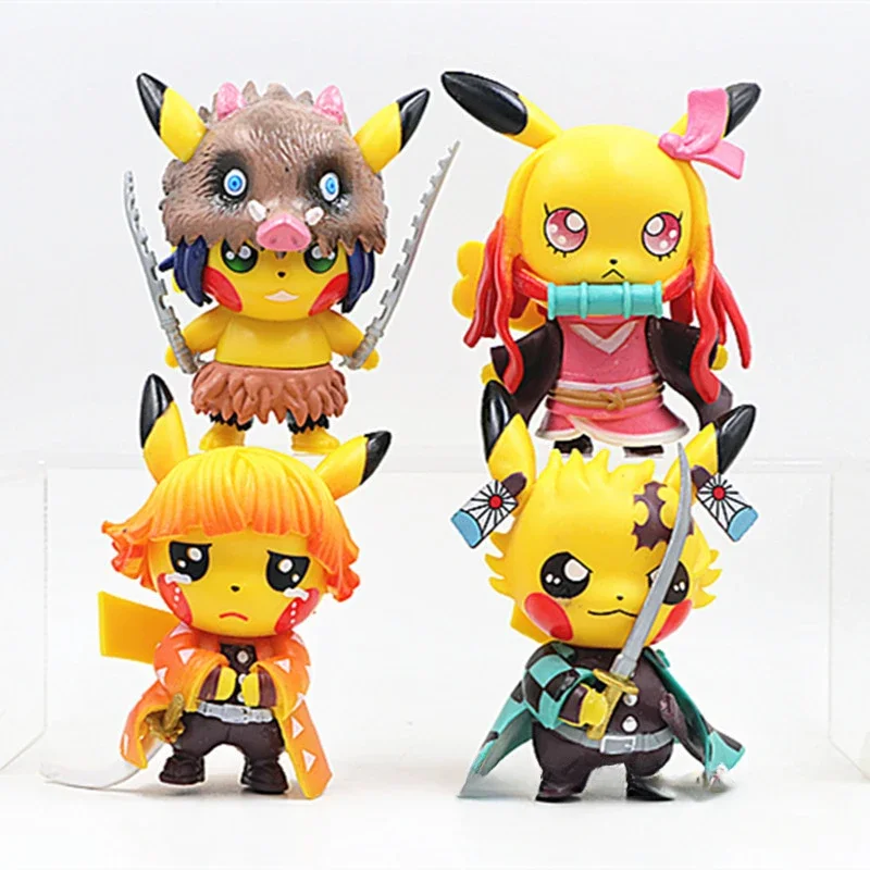 4 Uds Anime Pikachu Go figuras Pikachu Cosplay Demon Slayer Tanjirou Nezuko Zenitsu Inosuke colección de PVC niños juguete para regalo de cumpleaños