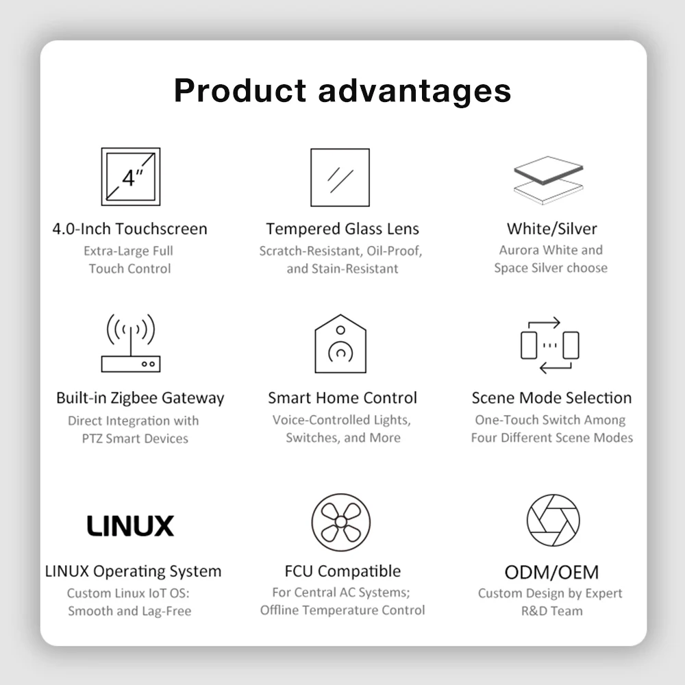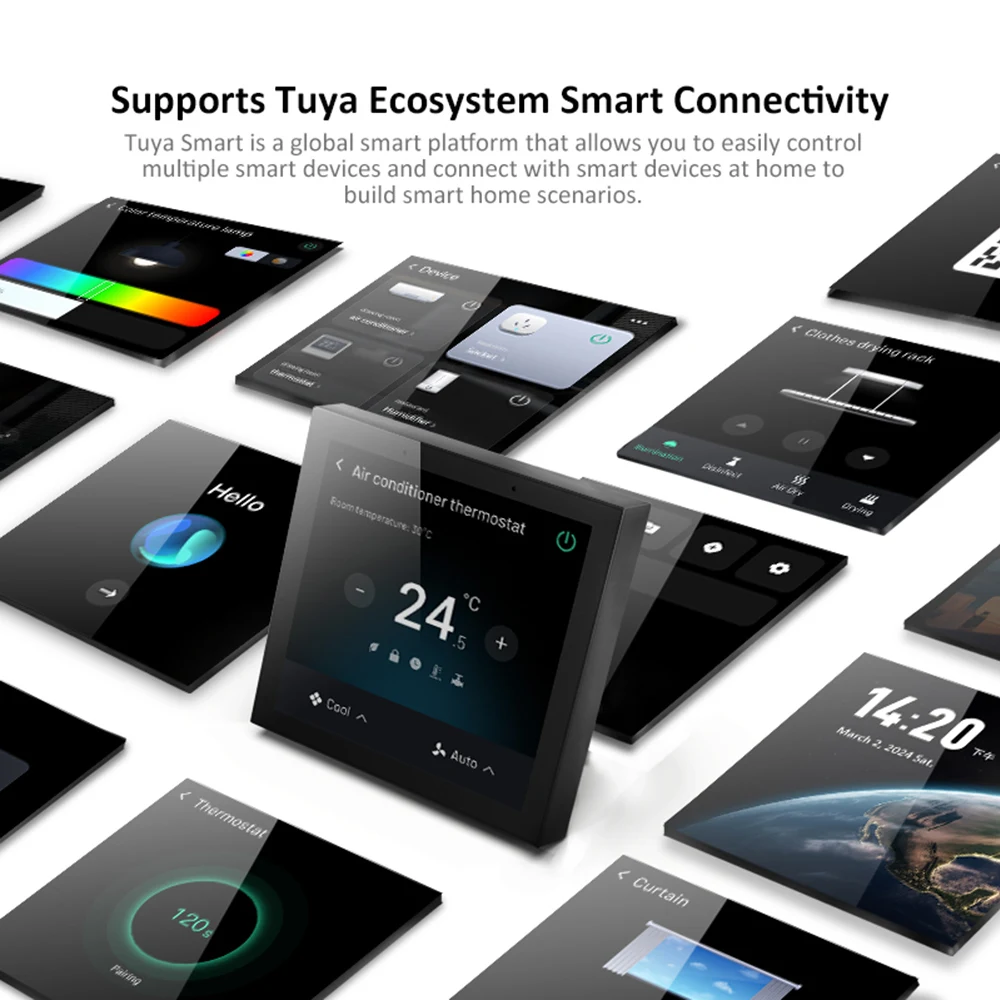 1.Vielseitiges interaktives Gerät: Der intelligente Touchscreen ist ein multifunktionales interaktives Gerät, das einen Bildschirm integriert.Steuern Sie verschiedene Heimgeräte und Szenen direkt vom Bildschirm und ersetzen Sie herkömmliche Schalter zur Steuerung durch die Relaiskanäle.