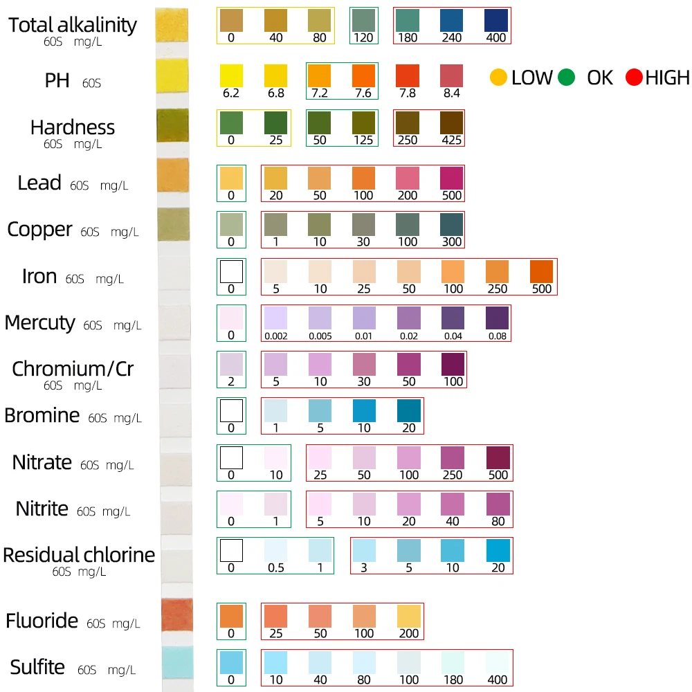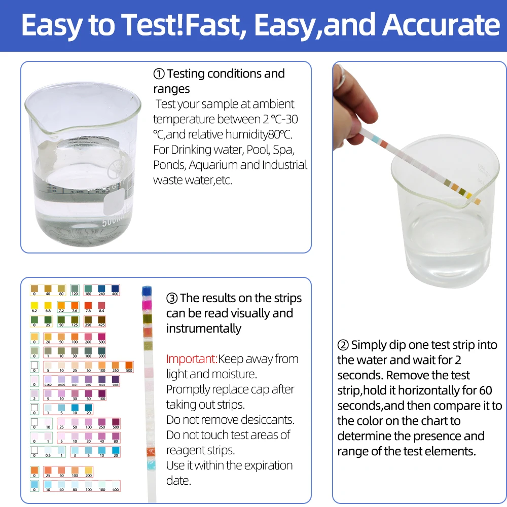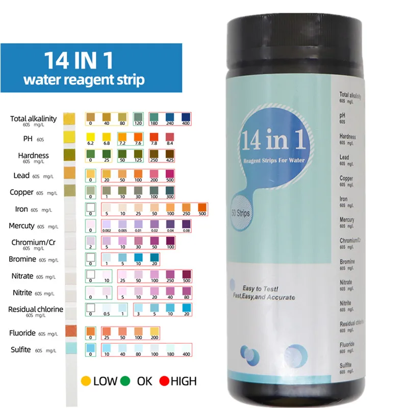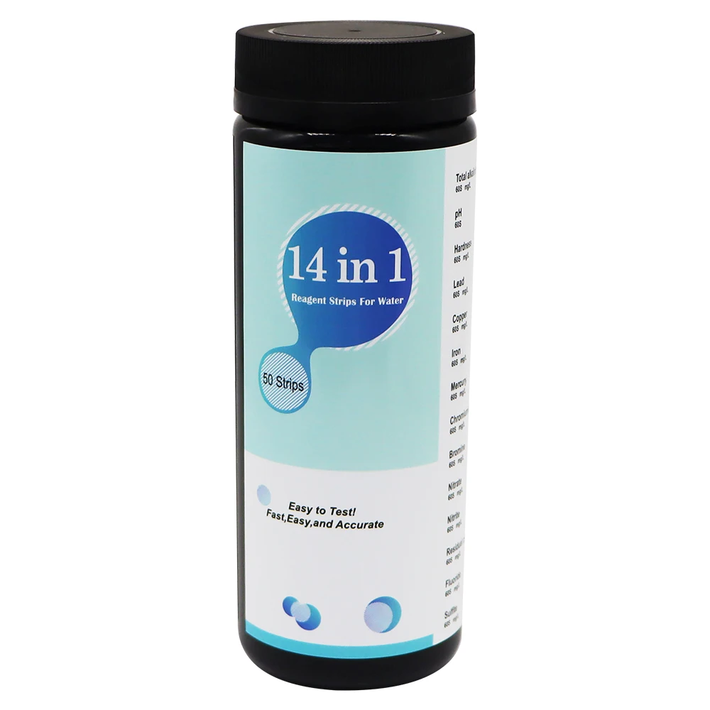 Tiras reactivas 14 EN 1 que pueden probar alcalinidad total, PH, dureza del agua, plomo, cobre, hierro, mercurio, cromo/cromo (VI), cromo, nitrato, nitrito, corina reidual, fluoruro y sulfito.