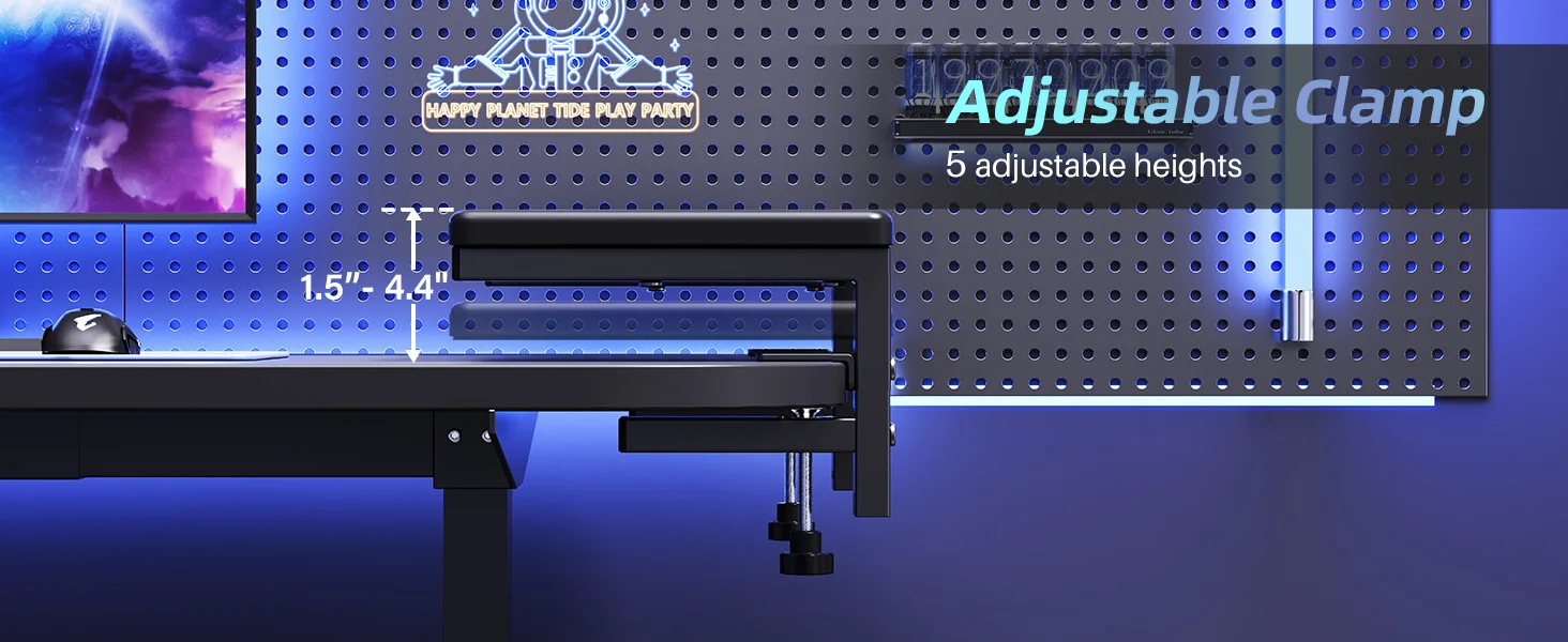 Estante de altura ajustable: Hemos agregado orificios ajustables para usar con abrazaderas en C, que se pueden ajustar a 5 alturas de 1,5 a 4,4 pulgadas cuando se sujetan al interior o exterior del escritorio, que se pueden adaptar de manera flexible a las necesidades de diferentes escenarios