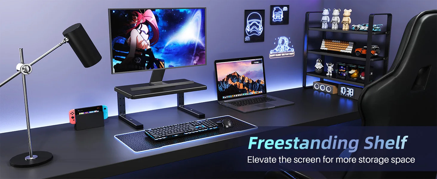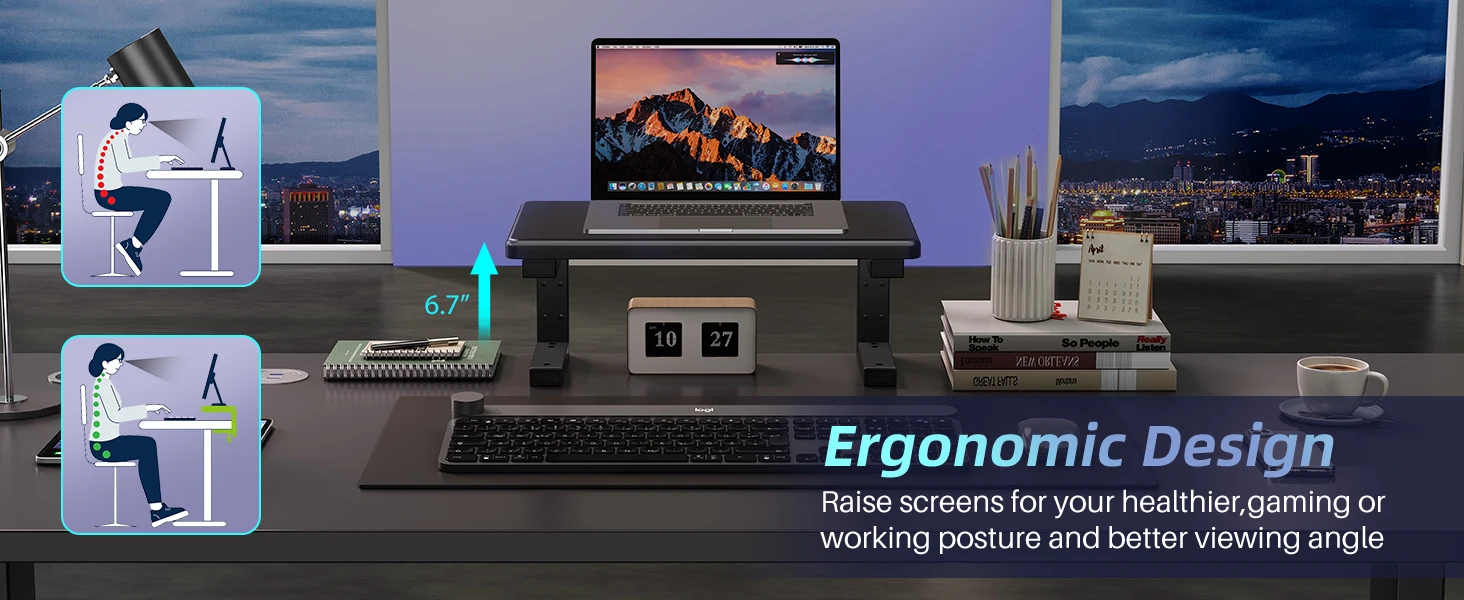 Estante para monitor multifuncional: este estante para monitor multifuncional viene con un diseño de patas independientes que permite colocarlo fácilmente en cualquier lugar de su escritorio.Su altura de 6,7 pulgadas es perfecta para usar como soporte para computadora portátil o monitor de computadora, diseñado ergonómicamente para elevar eficazmente la posición de la pantalla y ayudarlo a lograr el ángulo de visión más cómodo.