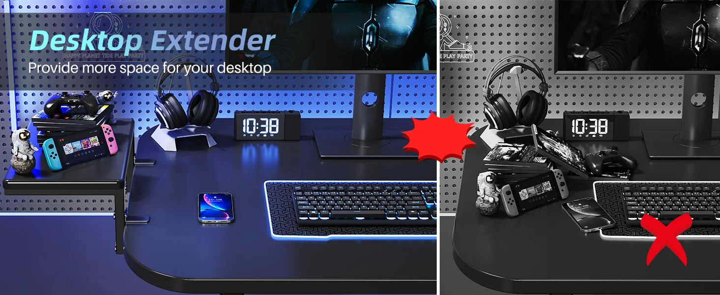 Amplíe el espacio de su escritorio: el estante de escritorio multiusos se monta en el costado de su escritorio y se convierte en un práctico extensor de escritorio para ayudarlo a liberar espacio adicional en el escritorio.Tiene capacidad para hasta 55 libras de artículos, dispositivos de juegos, dispositivos de escritorio, decoraciones y más para crear más espacio para usted.