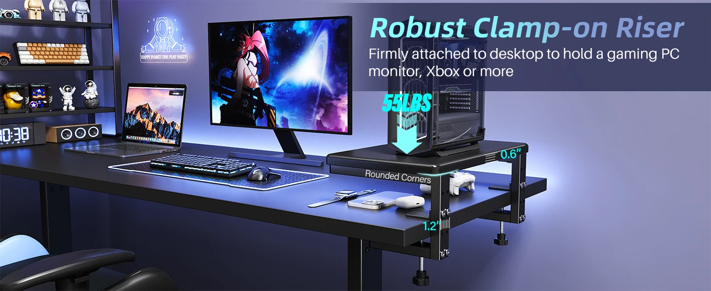 Abrazaderas en C resistentes: dos abrazaderas en C duraderas no solo son fáciles de instalar, sino que también se sujetan de forma segura a su escritorio.Se pueden sujetar y girar hacia adentro hasta el borde del escritorio, agregando una plataforma alta de 16,5 pulgadas x 9,8 pulgadas y espacio de almacenamiento adicional, perfecto para guardar computadoras portátiles y monitores.