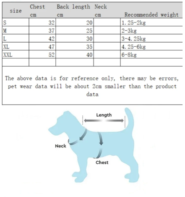 Nota: Elija la ropa para mascotas de acuerdo con el tamaño que mostramos, asegúrese de que el tamaño sea adecuado para su mascota.