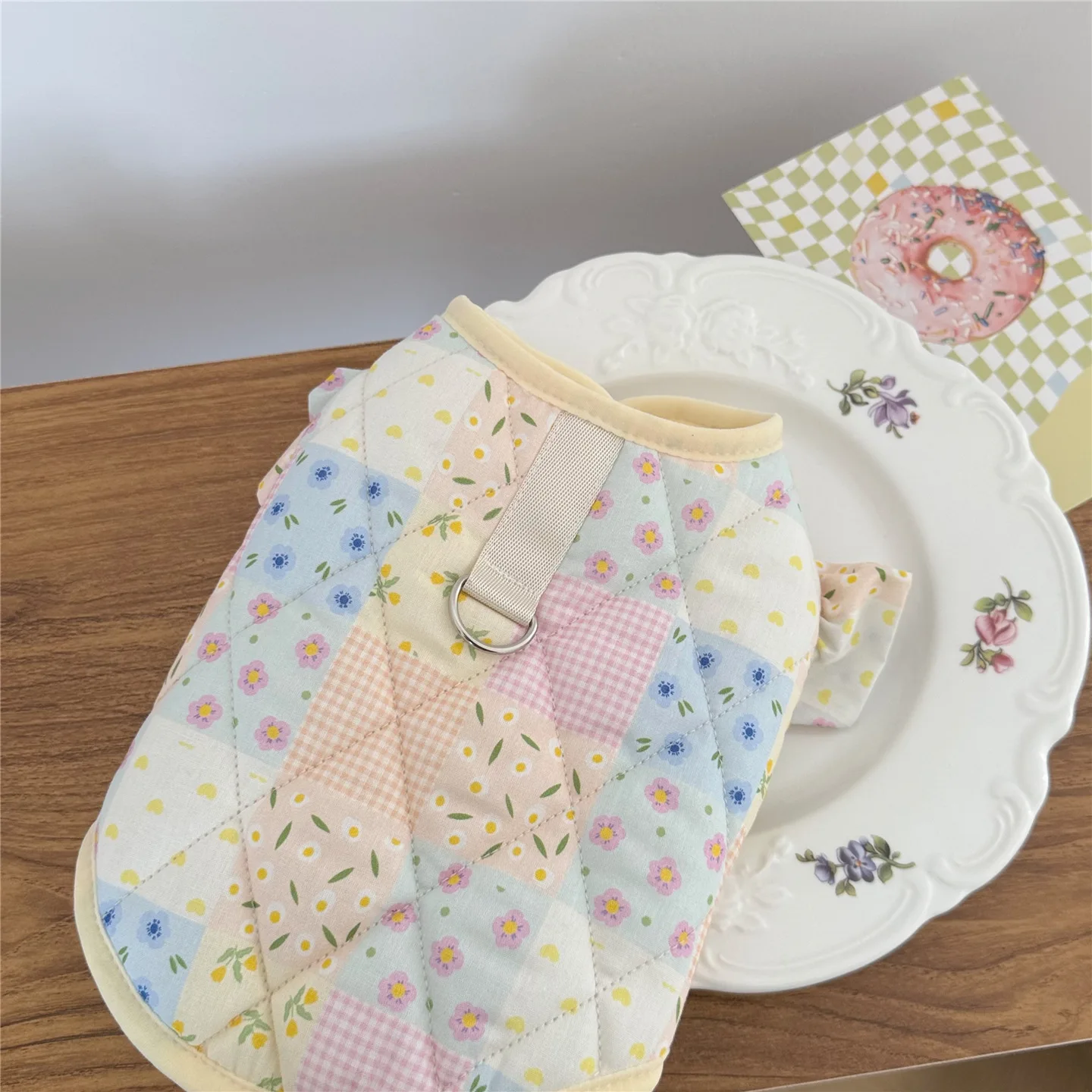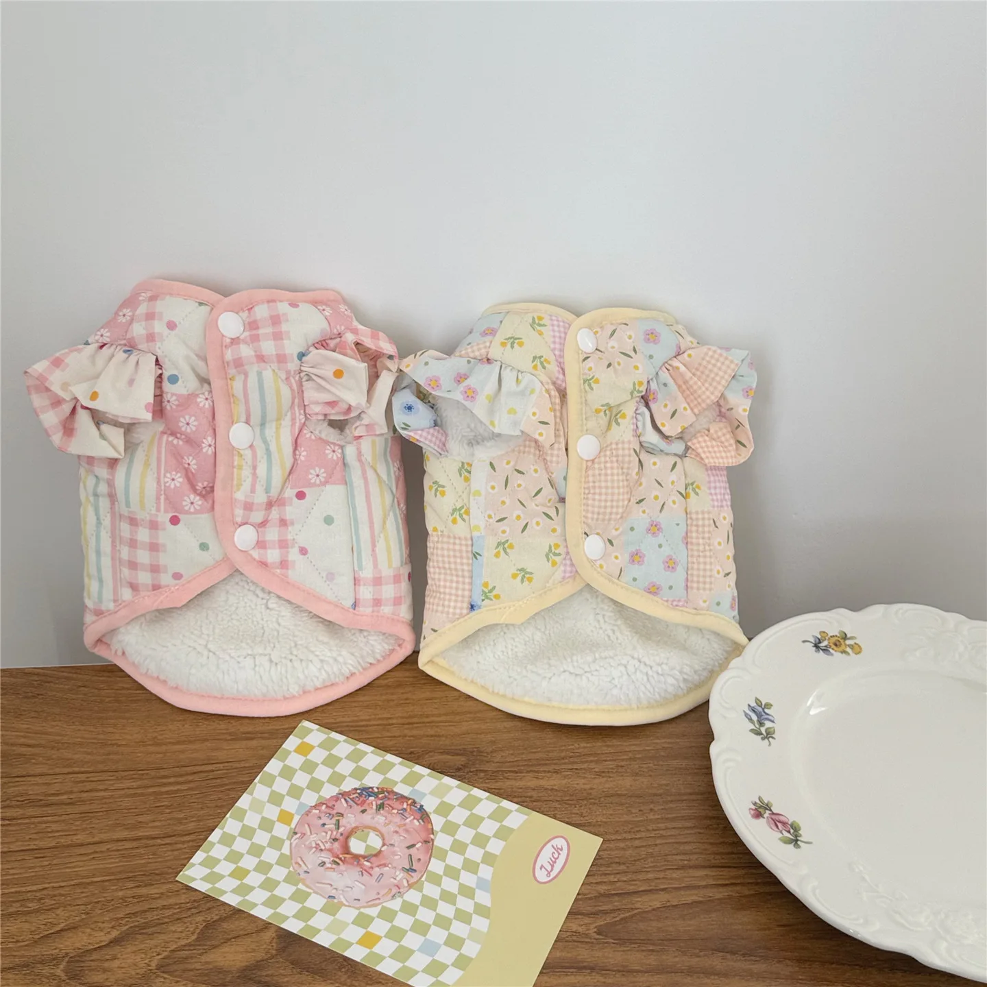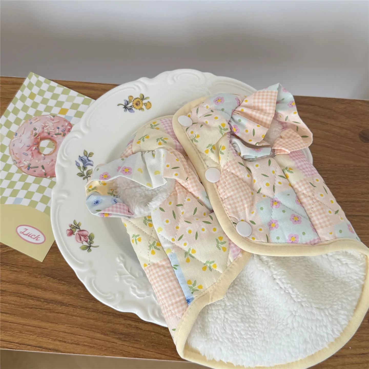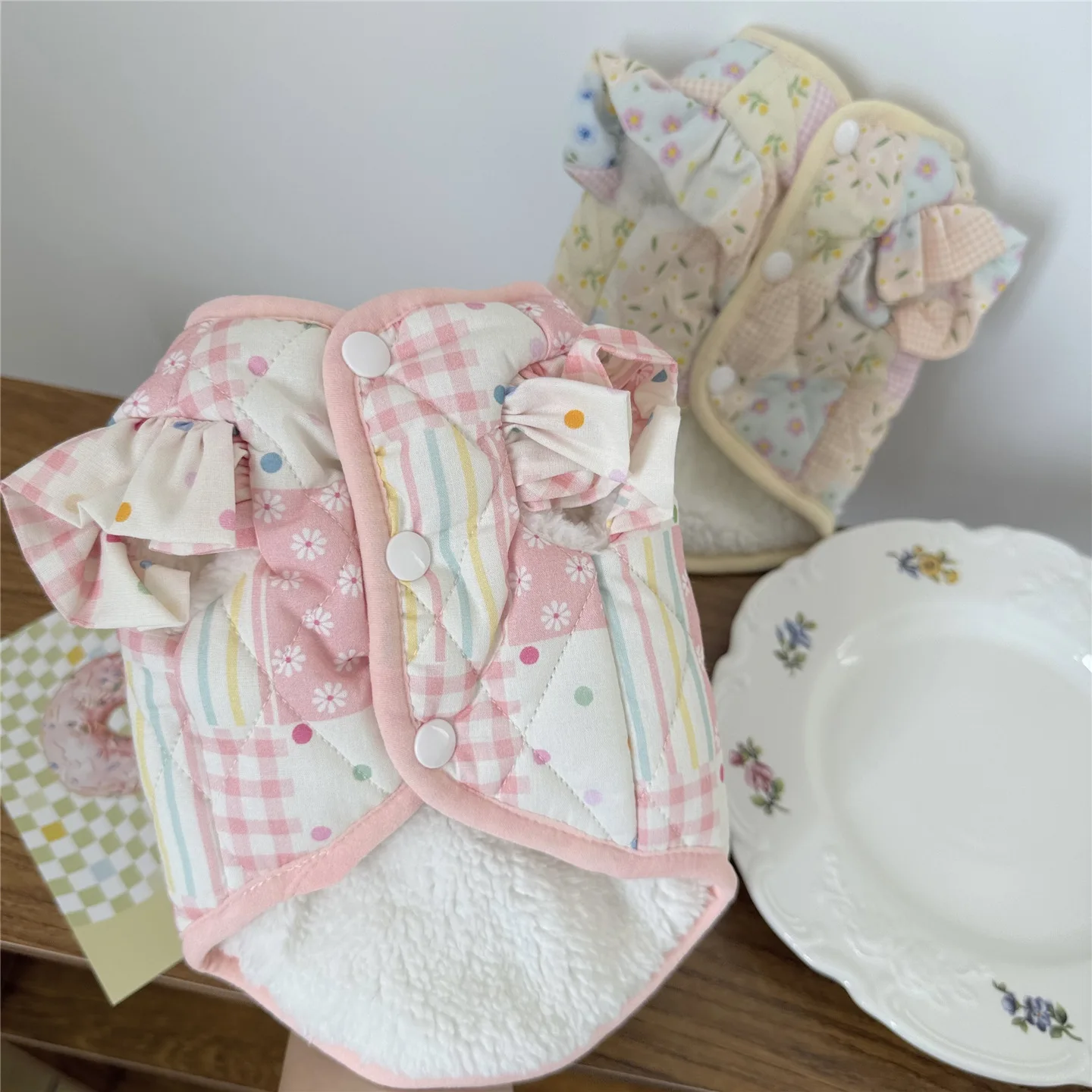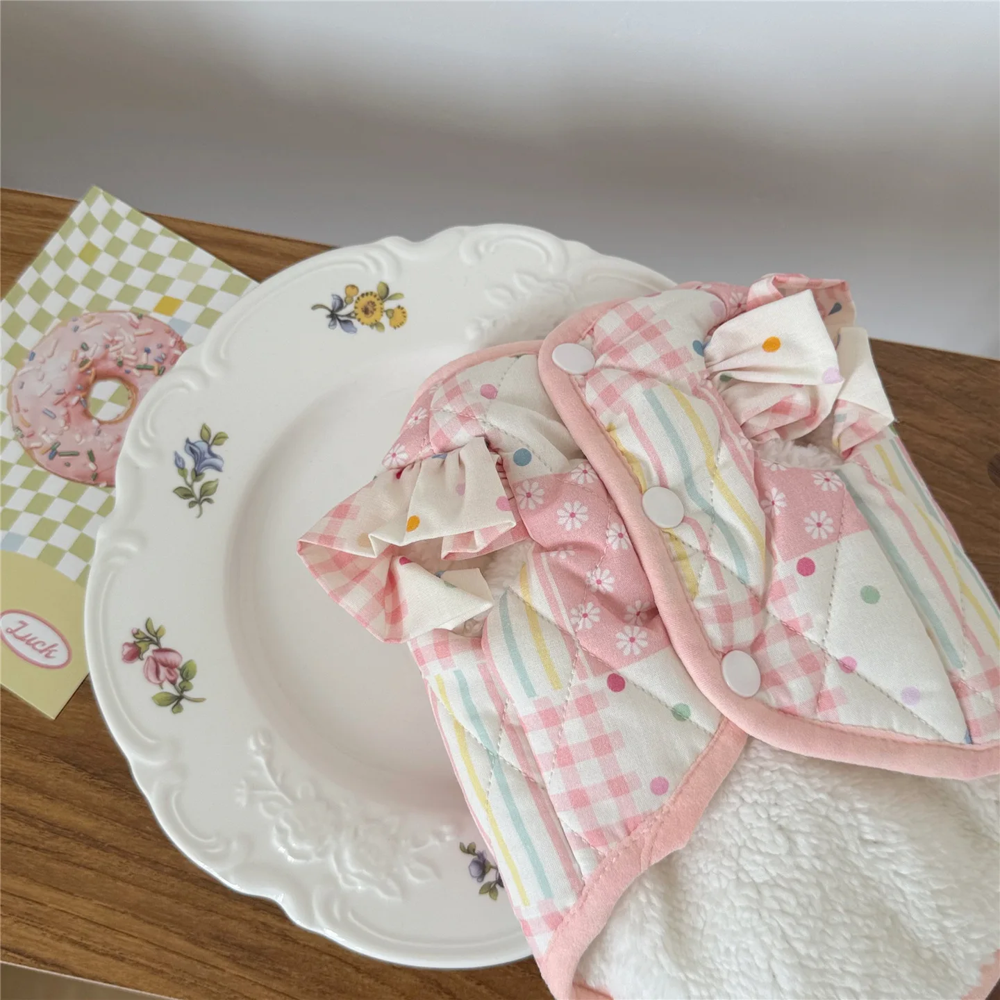 Abrigo a cuadros Floral rosa para mascotas, chaleco cálido grueso, abrigo de peluche para perros pequeños, ropa para perros pequeños, ropa para cachorros, otoño e invierno