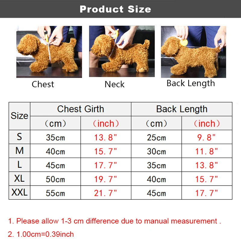 1. Primero, mida el pecho, la longitud de la espalda y la circunferencia del cuello de su mascota y luego elija el tamaño apropiado de acuerdo con la tabla de tamaños del producto. 2. En segundo lugar, el tamaño de la ropa que elijas debe ser 2-3 cm más grande que el tamaño de tu perro. 3. Para la ropa de dos piernas, preste atención a la circunferencia del pecho, y para las cuatro piernas, debe adaptarse a la circunferencia del pecho y la longitud de la espalda. 4. Para la mascota en crecimiento, será mejor que elijas la talla más grande. 5. Si el tamaño está entre 2 tamaños, elija el tamaño grande.