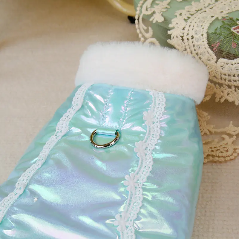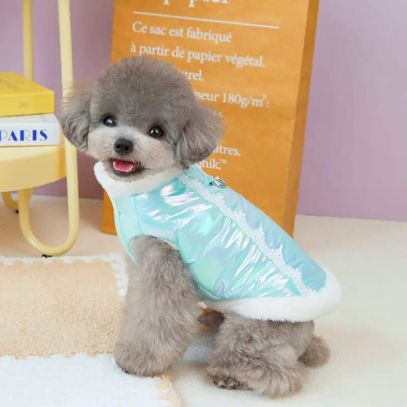 Abrigo de invierno de lujo para perro, decoración de encaje de princesa, chaleco acolchado de algodón rosa brillante y azul, chaqueta para perros pequeños y medianos, ropa cálida para mascotas y gatos
