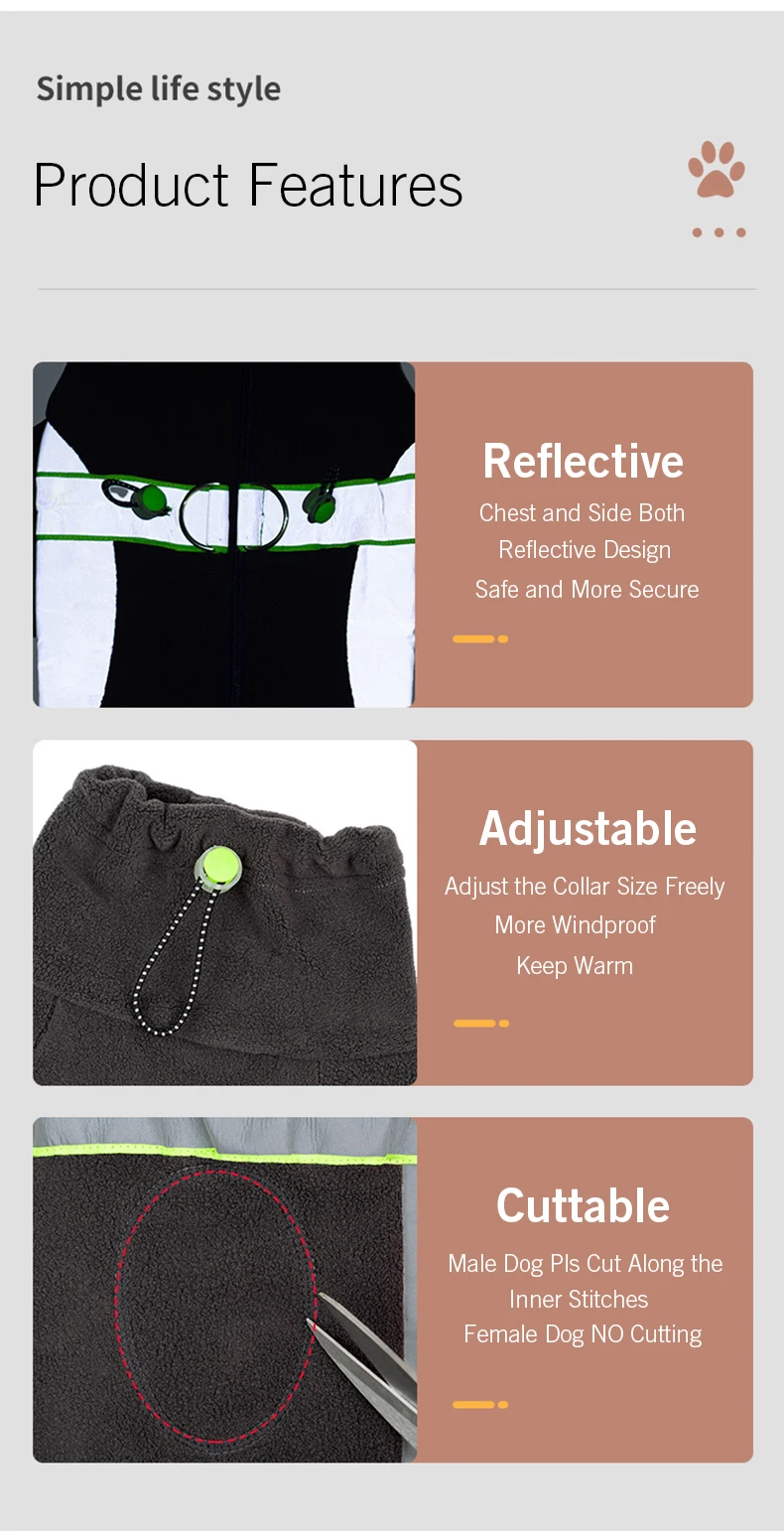 Característica:Diseño cortable cálido, reflectante, ajustable, para perros masculinos y femeninos.