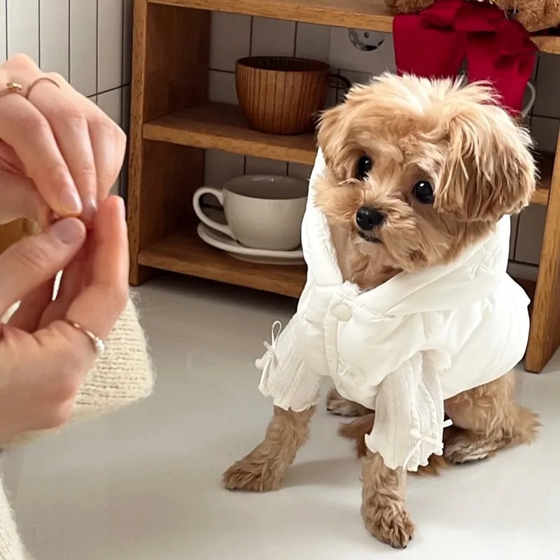 Abrigo de perro bordado con lazo a la moda, chaqueta de plumón elegante con oso de peluche, abrigo con capucha cálido para invierno, accesorios gruesos para mascotas