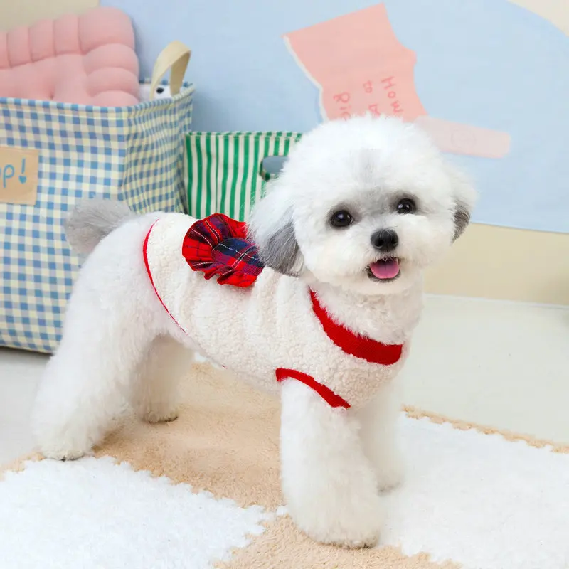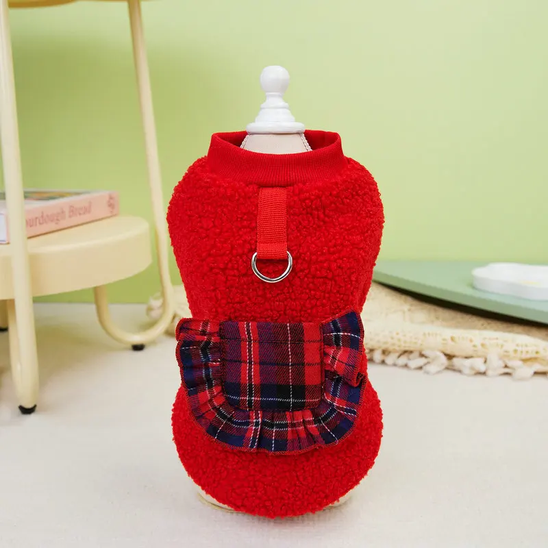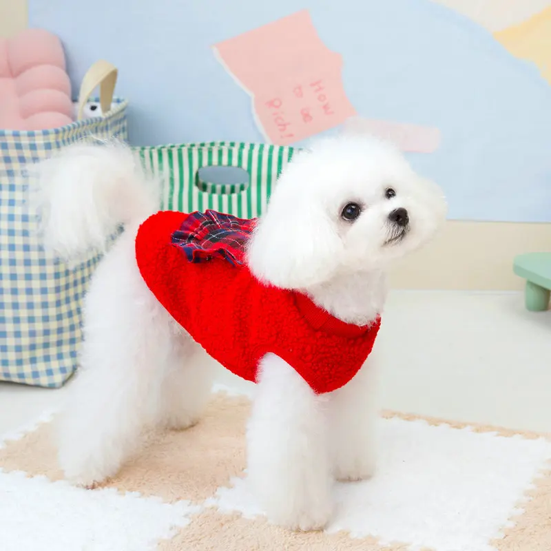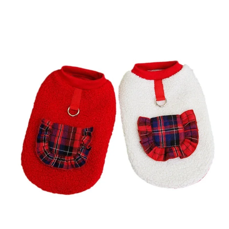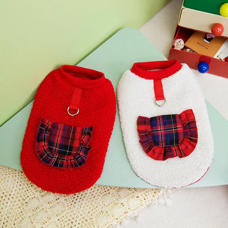 Abrigo de terciopelo a cuadros para otoño/invierno para mascotas, abrigo de Navidad, bonito bolsillo de encaje a cuadros, oso de peluche, perro pequeño, abrigo de terciopelo de cordero